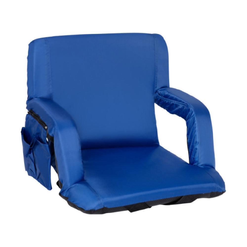 The Flash Furniture FV-FA090-BL-GG Stadium Bleacher Chair is a portable seating solution designed for both comfort and convenience, catering to fans, spectators, and event-goers. This chair supports a weight capacity of 265 lbs, providing robust support. It features a padded back and seat, ensuring comfort during extended use. The chair is constructed with a durable metal frame, offering stability and longevity. Its six reclining positions allow users to adjust the chair to their preferred angle for optimal relaxation. The versatile design permits use with or without armrests, accommodating personal preferences. The chair is equipped with adjustable backpack straps for easy transport, making it ideal for outdoor events and sports games. Made from durable poly fabric, it combines comfort with resilience. Practical storage solutions include dual side pockets, a rear zippered storage area, and an elastic arm pouch, providing ample space for personal belongings. The chair's vibrant blue color adds a touch of style, and its no-assembly-required setup ensures immediate usability. This stadium bleacher chair is a must-have for anyone seeking a reliable, comfortable, and portable seating option in various outdoor and indoor settings.