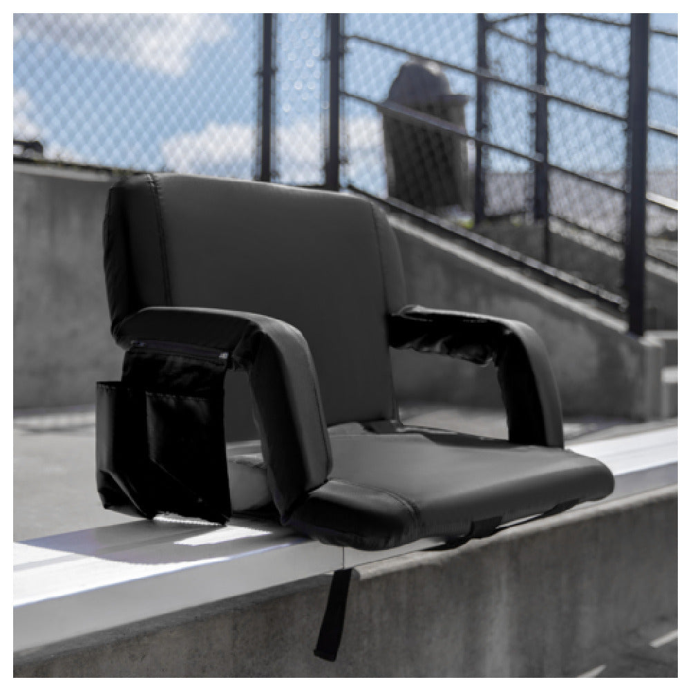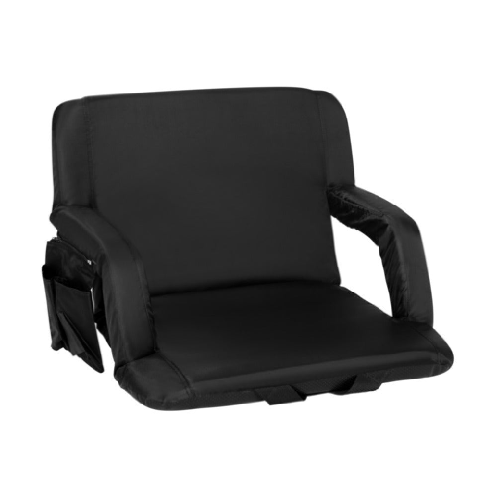 The Flash Furniture FV-FA090L-BK-GG Stadium Bleacher Chair stands out with its thoughtful design tailored for comfort and convenience, ideal for sports enthusiasts and outdoor event attendees. This portable chair supports up to 265 lb and features an extra-wide seating area, enhancing comfort during extended use. Constructed with a durable metal frame and covered in poly fabric, it ensures both strength and ease of maintenance. The chair offers six reclining positions, allowing users to adjust their seating posture for optimal relaxation. Its padded back and seat contribute significantly to the user’s comfort, whether used with or without the armrests. For added functionality, the chair is equipped with dual side pockets and a rear zippered storage compartment, perfect for keeping personal items safe and accessible. Additionally, an elastic arm pouch provides additional storage convenience. Transporting this chair is hassle-free, thanks to the adjustable backpack straps, making it an excellent choice for those on the go. Available in a sleek black finish, the chair requires no assembly, making it ready to use right out of the box. The Flash Furniture Stadium Bleacher Chair is an excellent solution for anyone seeking a comfortable, portable seating option at outdoor events.