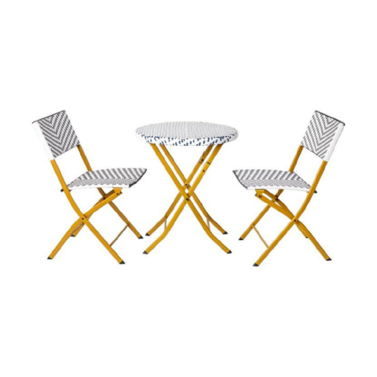 The Flash Furniture FV-FWA085-NVY-WHT-GG Rouen Three Piece Commercial Grade Foldable French Bistro Set is a versatile and stylish furniture choice for both indoor and outdoor settings. This set includes a table and two chairs, each crafted with navy and white PE rattan for the back, seat, and tabletop, ensuring a chic aesthetic that complements various decor styles. The natural steel frames provide robust support and durability, making the set suitable for commercial use. One of the standout features of the Rouen set is its foldable design, which allows for easy storage and transport, making it a practical addition to cafes, restaurants, and patios with limited space. The commercial-grade construction ensures longevity and resilience to everyday wear and tear, while the use of PE rattan offers weather resistance, making it an ideal choice for outdoor environments. This bistro set not only enhances the visual appeal of any space but also provides comfort and convenience, catering to the needs of hospitality businesses and homeowners alike. Its blend of functionality, style, and durable materials makes the Flash Furniture Rouen Bistro Set a valuable asset in the realm of commercial and residential furniture solutions.
