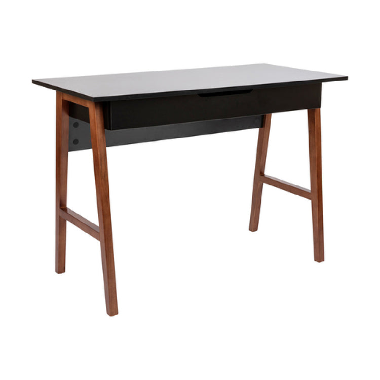 The Flash Furniture GC-MBLK60-BK-WAL-GG Computer Desk With Divided Storage Drawer is a meticulously designed piece of furniture crafted to blend functionality with style. Featuring a black laminate finish top, this desk provides a sleek and professional aesthetic suitable for various office environments. The desk is supported by an A-frame walnut finish base, which not only adds a touch of elegance but also ensures structural stability and durability. A standout feature of this desk is its divided storage drawer, offering organized storage solutions ideal for keeping office essentials neatly arranged and easily accessible. This thoughtful design makes the desk perfect for both professional and home office settings, accommodating the needs of tech-savvy professionals and students alike. Its compact and efficient design caters to small spaces without compromising on workspace. The harmonious combination of black and walnut finishes creates a versatile piece that complements various decor styles, making it a valuable addition to any workspace.