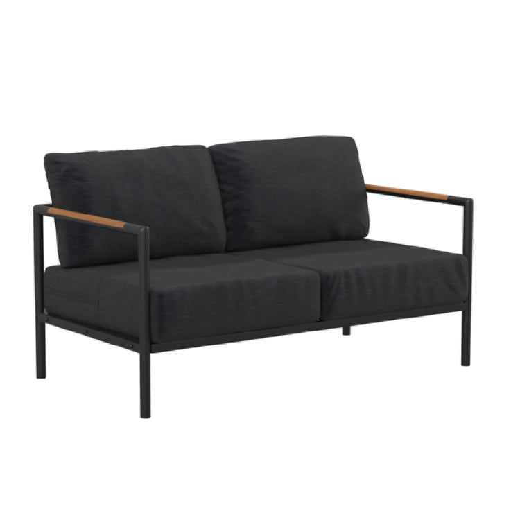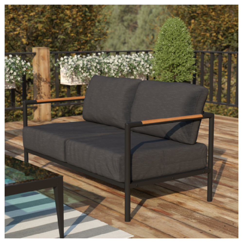 The Flash Furniture GM-201027-2S-CH-GG Lea Patio Loveseat is a robust seating solution, designed with a significant weight capacity of 600 lbs, making it suitable for diverse settings, from private home patios to commercial outdoor spaces. Its construction features a black powder-coated aluminum frame, providing a durable foundation resistant to weathering and corrosion. The loveseat's design is enhanced by teak arm accents, which add a touch of elegance and warmth to its overall aesthetic. The seat and back cushions, upholstered in a charcoal fabric, ensure comfort while maintaining a style that complements various outdoor decors. Assembly is required, allowing for ease of transport and installation. This loveseat is ideal for those who prioritize both style and substance in outdoor furniture, catering to a wide range of market segments by offering both functional durability and aesthetic versatility. Its thoughtful design elements and high weight capacity make it well-suited for residential and commercial use, providing a reliable and stylish seating option for patios, terraces, and gardens.