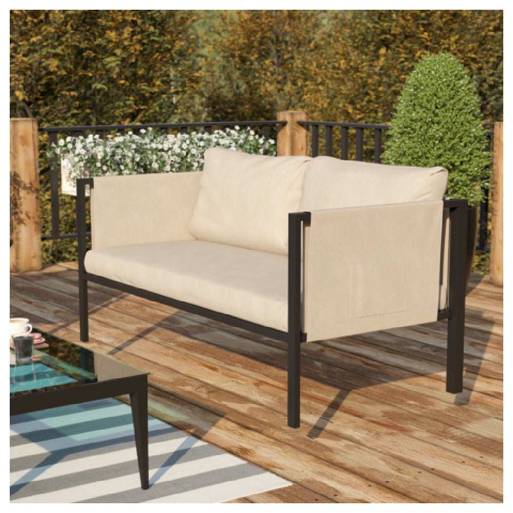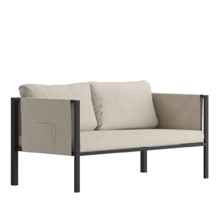 The Flash Furniture GM-201108-2S-GY-GG Lea Patio Loveseat is a robust seating solution, boasting a substantial 600 lb. weight capacity to cater to diverse needs across various market segments. Engineered with a black powder-coated galvanized steel frame, this loveseat ensures durability and resistance to the elements, making it an ideal choice for both residential and commercial outdoor spaces. The inclusion of fabric back and seat cushions provides added comfort, allowing users to enjoy extended periods of relaxation. This loveseat features dual storage pockets, offering convenient space for storing personal items or outdoor accessories, enhancing its functionality. Available in a neutral beige color, the loveseat seamlessly integrates into a variety of patio aesthetics. Assembly is required, allowing for straightforward setup. The combination of its sturdy construction, practical storage solutions, and comfort-focused design makes the Flash Furniture GM-201108-2S-GY-GG Lea Patio Loveseat a compelling choice for those seeking reliable outdoor furniture that meets the demands of multiple user segments.