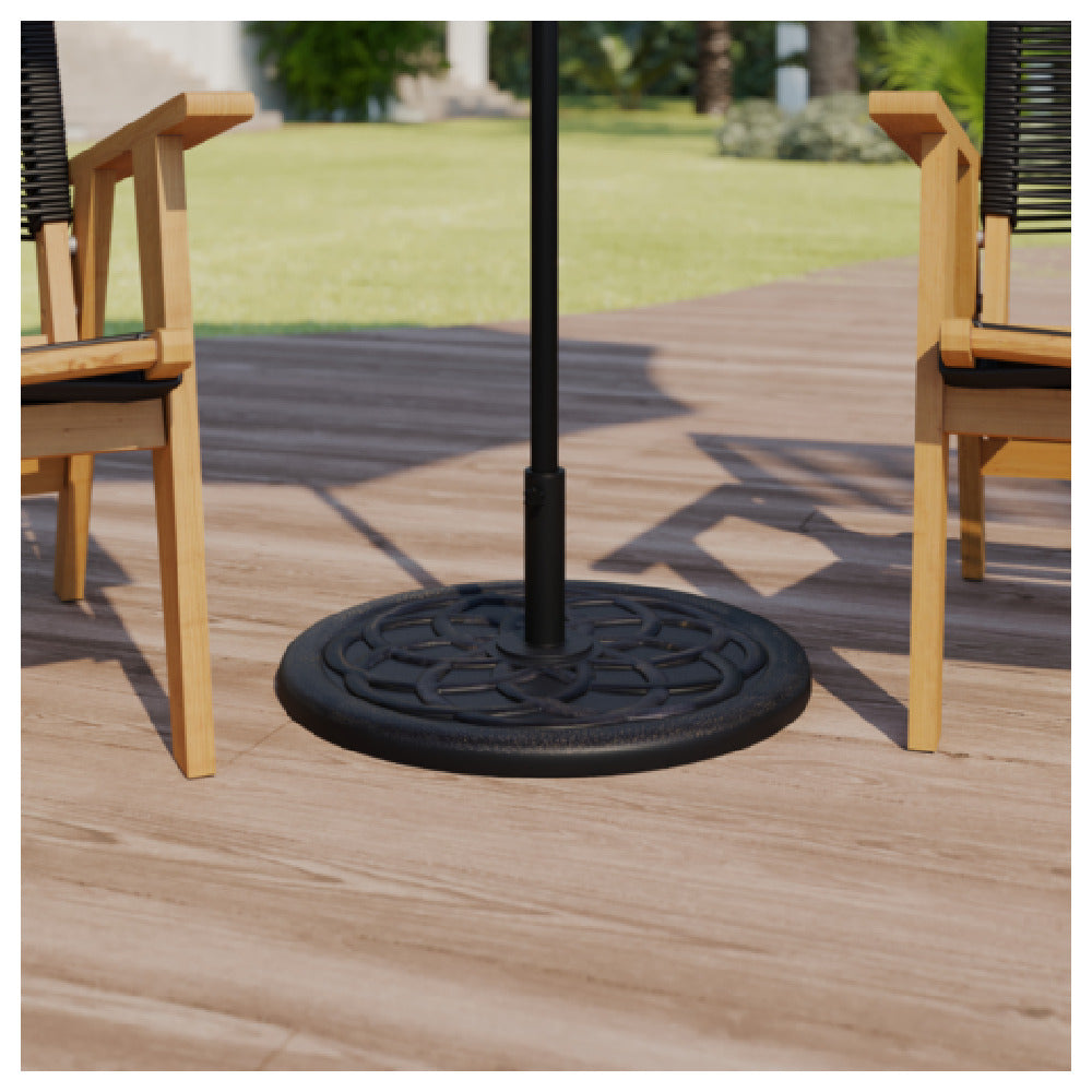 The Flash Furniture GM-UB19-BRNZ-GG Kona Umbrella Base is a versatile and durable option for supporting stand-alone umbrellas up to 10 feet in height. With a diameter of 19-1/4 inches, this umbrella base combines style and functionality, making it suitable for both residential and commercial use. Constructed with a robust powder-coated steel post, this base is designed for long-lasting durability and resistance to the elements. Weighing 30 pounds, it provides the necessary stability to securely hold umbrellas in place, even in windy conditions. The base includes three adapters, accommodating poles up to 2 inches in diameter, providing flexibility for various umbrella designs. Its round shape, combined with a bronze finish, adds a touch of elegance to outdoor settings. The use of cement and plastic polymer coating ensures additional strength and resistance, making it a reliable choice for any patio or outdoor space. The Flash Furniture GM-UB19-BRNZ-GG Kona Umbrella Base not only enhances the aesthetic appeal of its surroundings but also ensures functionality and stability, catering to different segment markets such as hospitality, residential, and corporate environments where outdoor comfort and style are paramount.