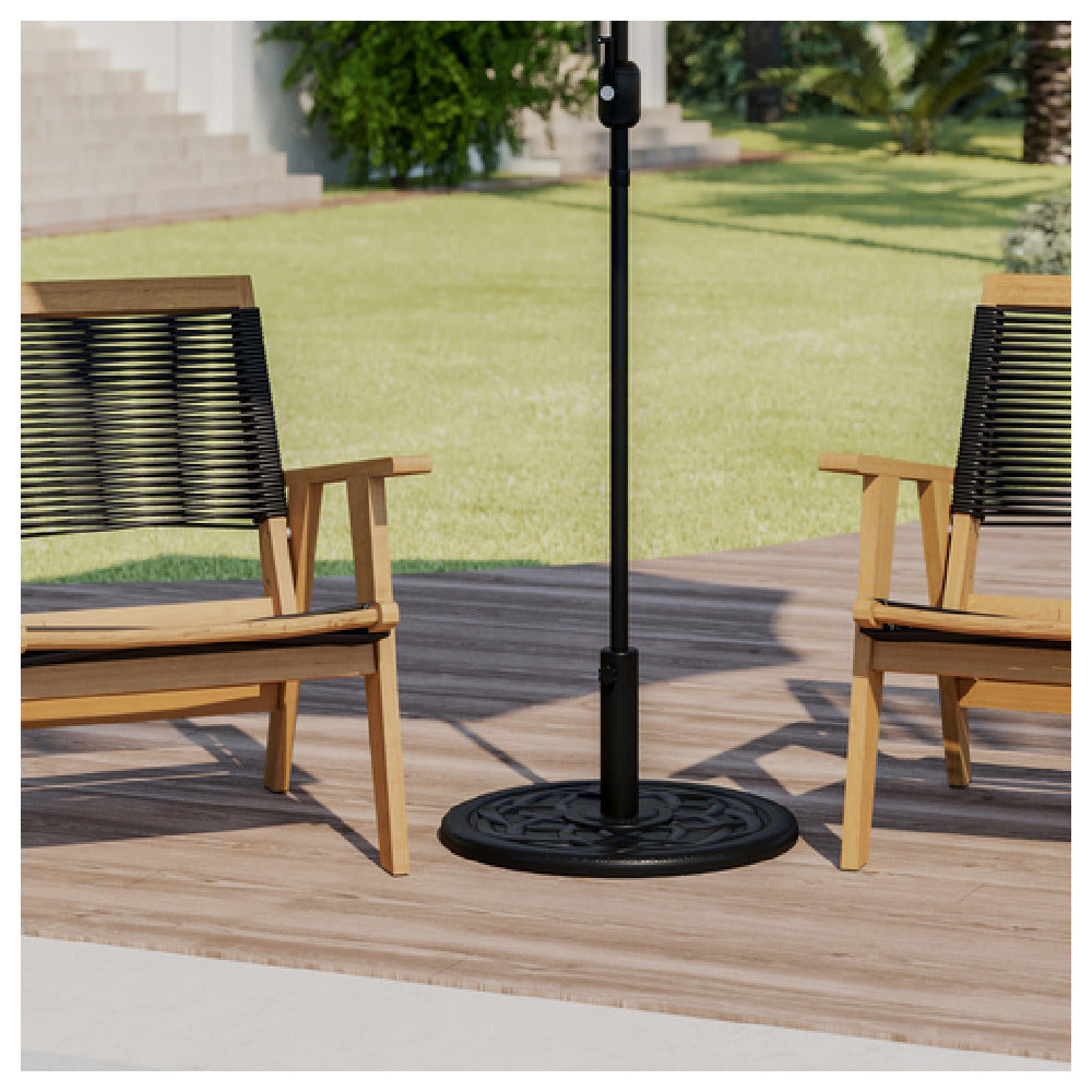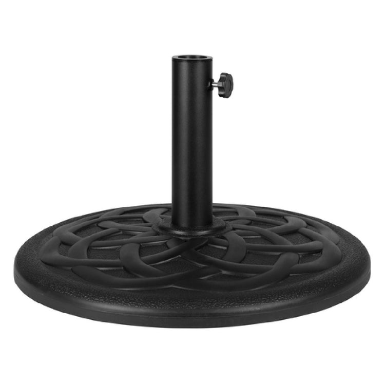 The Flash Furniture GM-UB19-BZ-GG Umbrella Base is a reliable and versatile solution for securing standalone umbrellas with a diameter of up to 10 feet. Engineered with a 19-1/4-inch diameter round base, it combines stability and durability, weighing 30 pounds. This umbrella base is constructed with a powder-coated steel post, ensuring resistance to weather and corrosion, making it ideal for outdoor use. The inclusion of a cement core further enhances its sturdiness, while the plastic polymer coating provides an additional layer of protection. Designed to accommodate various pole sizes, it comes equipped with three adapters that support poles up to 2 inches in diameter, offering adaptability for different umbrella designs. Finished in black, it blends seamlessly with a variety of outdoor decors. This product is readily available, with in-stock items typically shipping within 24 hours, making it a dependable choice for both residential and commercial outdoor settings. Its robust construction and thoughtful design cater to the needs of diverse market segments, including hospitality, residential, and recreational spaces, providing a secure foundation for umbrellas in various environments.