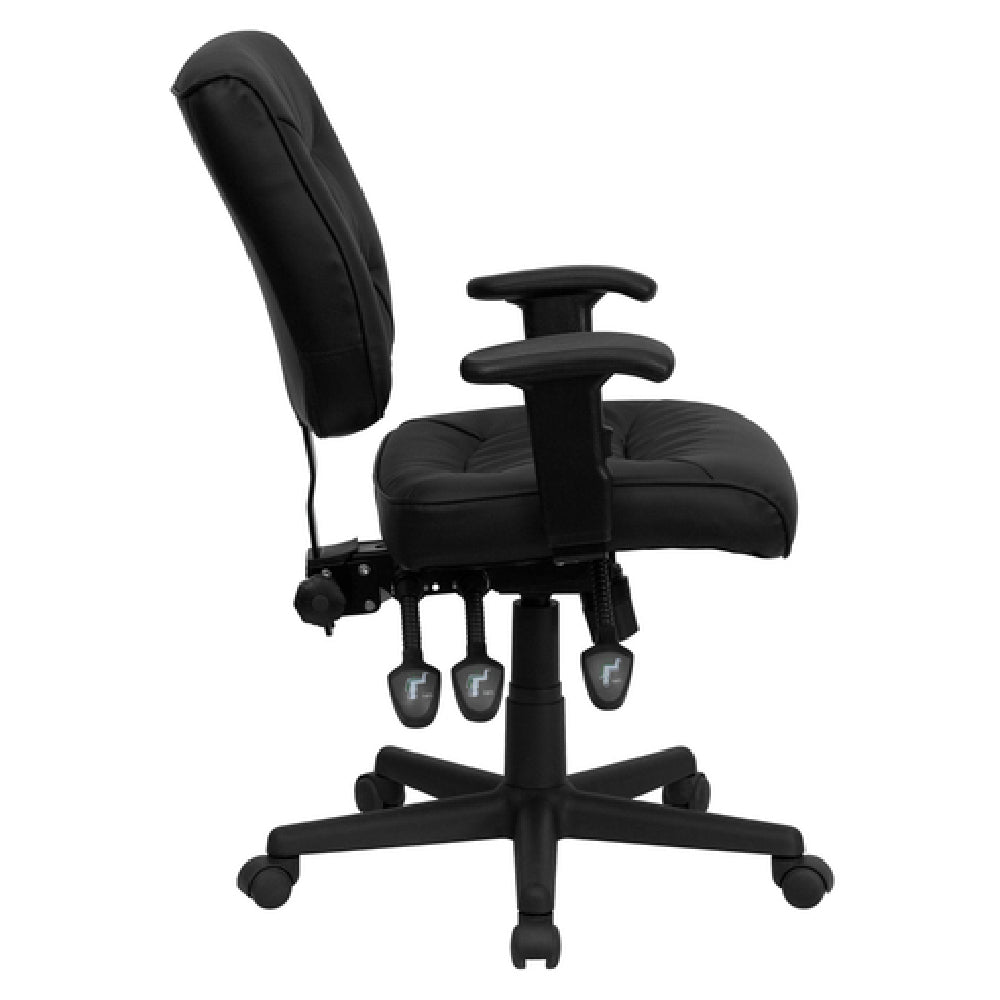 The Flash Furniture GO-1574-BK-A-GG Swivel Task Chair is a versatile seating solution designed for professional environments requiring adaptability and comfort. Featuring an adjustable height range from 34 inches to 40-1/4 inches, this chair caters to users of varying statures and preferences. With a weight capacity of 250 lbs, it ensures durability and support for most users. The mid-back design, coupled with a tufted back and contoured waterfall seat, provides ergonomic support, promoting better posture during prolonged use. Upholstered in LeatherSoft, a blend of leather and polyurethane, the chair offers enhanced softness and durability. Its triple paddle control mechanism allows precise adjustments, including back height and infinite-locking back angle, to suit individual needs. The multi-tilt lock mechanism and tilt tension adjustment knob further enhance the chair's customizable comfort. Additionally, the height-adjustable padded arms support a relaxed sitting position. Constructed with CA117 fire retardant foam, it meets essential safety standards. The heavy-duty black nylon base, equipped with dual wheel casters, ensures stability and smooth mobility. The chair requires assembly, and in-stock items typically ship within 24 hours, making it a practical choice for offices and workspaces seeking reliable, high-functionality seating solutions.