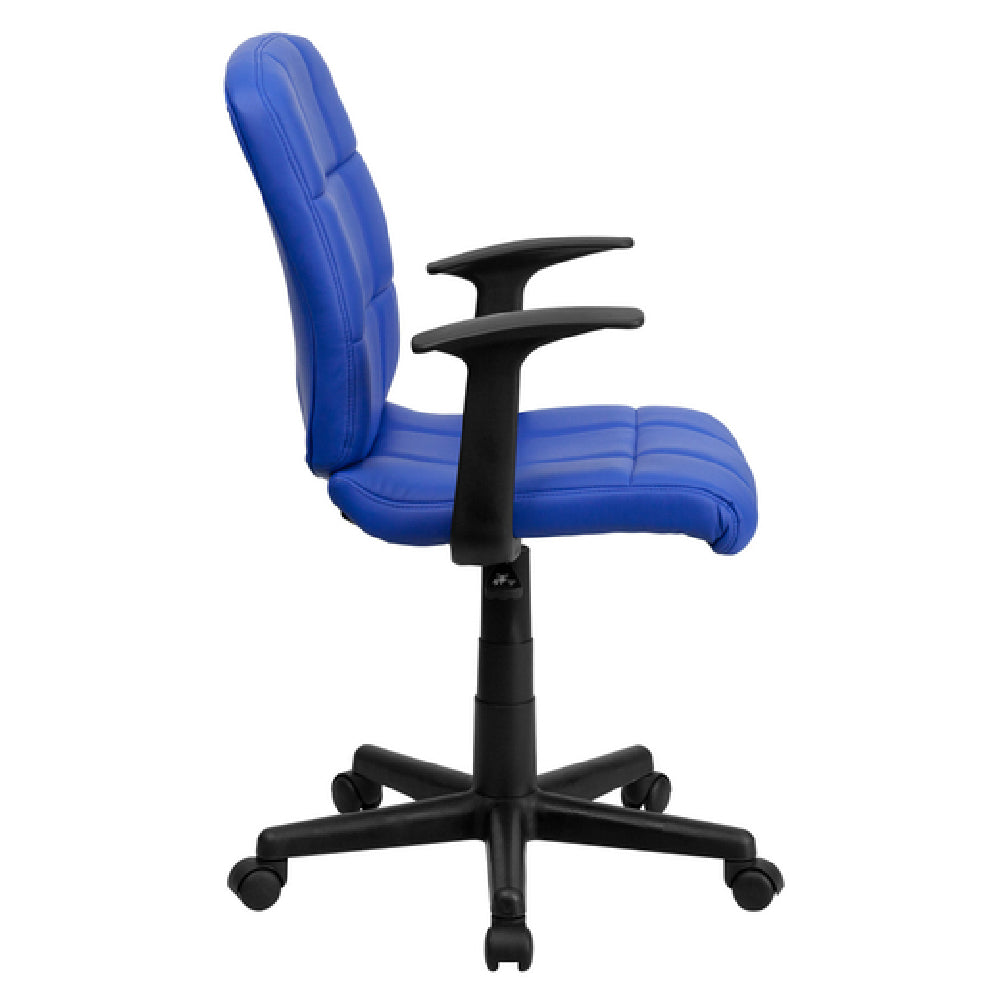 The Flash Furniture GO-1691-1-BLUE-A-GG Swivel Task Chair is a versatile seating solution, ideal for various office environments and workspaces. With an adjustable height ranging from 34" to 38-3/4", this chair offers flexibility to accommodate different user preferences and desk configurations, providing ergonomic comfort for extended periods. It supports a weight capacity of up to 250 lbs, ensuring durability and stability for a broad range of users. The chair's mid-back design, combined with a quilted design covering, contributes to both the aesthetic appeal and comfort, while the contoured seat and back enhance the ergonomic experience. Constructed with vinyl upholstery, the chair is easy to clean and maintain, making it suitable for high-use environments. This task chair is equipped with nylon arms for additional support and comfort. Safety and quality are prioritized with CA117 fire retardant foam, providing peace of mind in terms of compliance with fire safety standards. The heavy-duty black nylon base with dual wheel casters ensures smooth mobility across various floor surfaces, making it perfect for dynamic office settings. Available in blue, this chair requires assembly and is typically ready for shipment within 24 hours, ensuring quick and efficient delivery for immediate use.