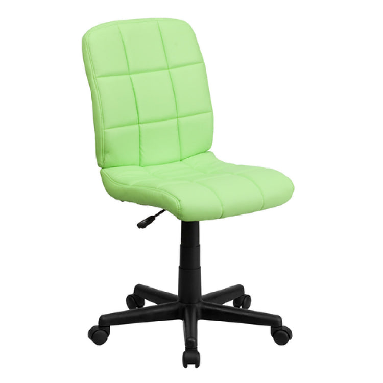 The Flash Furniture GO-1691-1-GREEN-GG Swivel Task Chair 34"-38-3/4" Adjustable Height is a versatile seating solution ideal for various professional and personal environments. With a 250 lb weight capacity, this chair is designed to accommodate a wide range of users. The mid-back design and quilted covering not only offer ergonomic support but also add a stylish touch to any space. The contoured seat and back enhance comfort, while the green vinyl upholstery provides durability and easy maintenance. This chair is CA117 fire retardant, showcasing its safety compliance. Built without arms, it offers unrestricted movement, making it suitable for tasks that require flexibility and reach. The heavy-duty black nylon base ensures stability and is paired with dual wheel casters for smooth mobility. Perfect for home offices, corporate environments, or creative studios, this chair meets diverse needs with its adjustable height feature, which ranges from 34" to 38-3/4". Assembly is required, and in-stock items usually ship within 24 hours, ensuring quick delivery for immediate use. The Flash Furniture GO-1691-1-GREEN-GG chair combines practicality, style, and comfort, making it a valuable addition to any workspace.