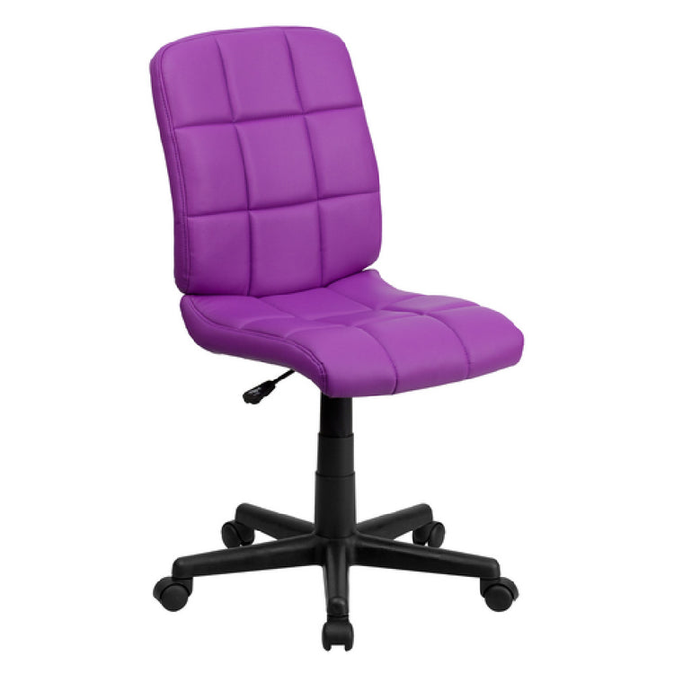 The Flash Furniture GO-1691-1-PUR-GG Swivel Task Chair 34"-38-3/4" Adjustable Height is a versatile seating solution engineered for diverse professional environments. Featuring a mid-back design and a quilted covering, this chair combines comfort with a contemporary aesthetic. The contoured seat and back are crafted with CA117 fire retardant foam, providing both safety and ergonomic support. With a robust weight capacity of 250 lb., it accommodates a wide range of users. Its purple vinyl upholstery adds a vibrant touch, making it suitable for creative spaces. The chair's heavy-duty black nylon base ensures stability, while dual wheel casters offer seamless mobility across different flooring types. The height adjustability between 34" to 38-3/4" allows personalization to suit various desk heights and user preferences. Notably, this chair is armless, promoting an unrestricted range of motion, which is particularly advantageous in dynamic workplace settings. The product requires assembly, and in-stock items generally ship within 24 hours, providing a quick solution for immediate seating needs. This task chair presents a compelling blend of functionality, style, and safety, making it an excellent choice for offices, home workstations, and other professional settings that demand reliable and stylish furniture.
