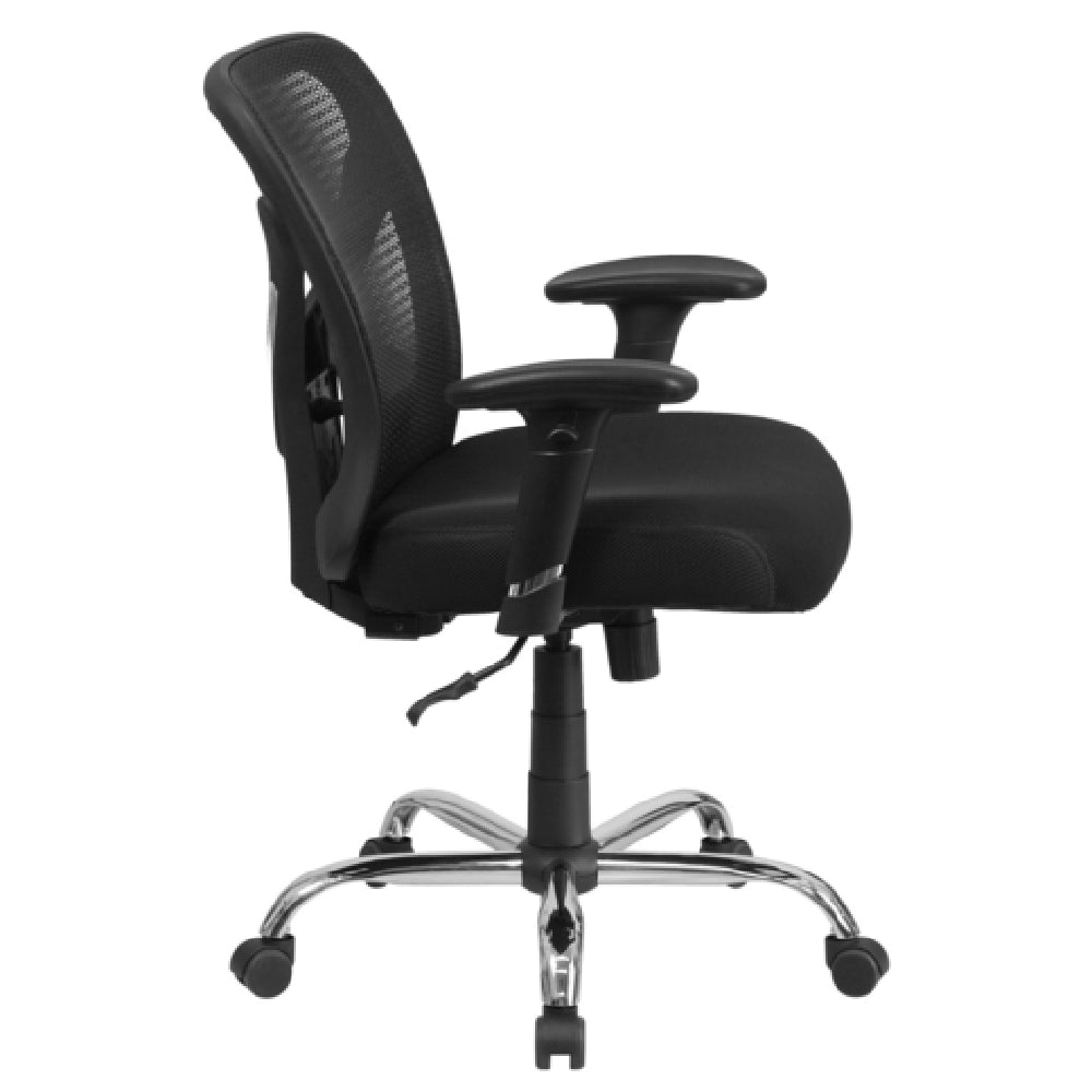 The Flash Furniture GO-2032-GG Hercules Series Big & Tall Swivel Task Chair 36"-42-1/4" Adjustable Height is engineered for superior comfort and durability, accommodating users up to 400 lb. This chair features a mid-back design and a ventilated mesh back, ensuring breathability and support during extended use. The 22"W x 2" thick padded mesh upholstered waterfall seat enhances ergonomic seating by promoting better circulation. A standout feature is the built-in lumbar support, offering targeted comfort for the lower back. The chair also includes a ratchet back height adjustment, allowing for personalized positioning. Users can customize their seating experience further with the tilt lock mechanism and tilt tension adjustment knob. The height-adjustable padded arms provide additional personalized support. Safety and resilience are ensured with CA117 fire retardant foam, while the chrome base and dual-wheel casters contribute to both stability and mobility. This versatile chair is ideal for office settings, home workspaces, and educational environments, providing a reliable seating solution that meets diverse ergonomic needs. Assembly is required, and in-stock items typically ship within 24 hours, making it a practical choice for those seeking immediate enhancements to their seating arrangements.