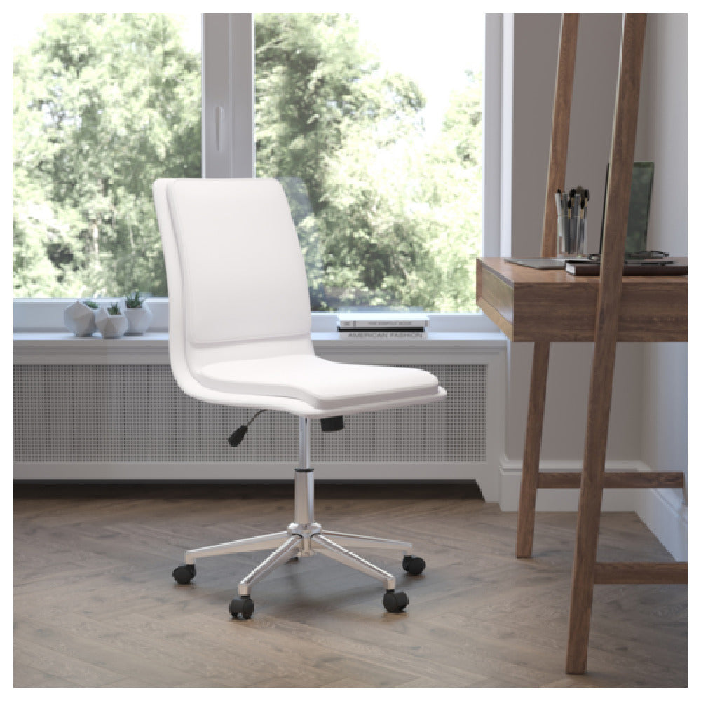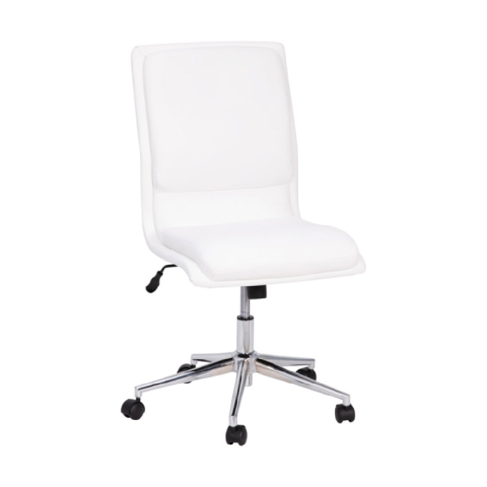 The Flash Furniture GO-21111-WH-GG Madigan Office Chair stands out with its robust and versatile design, tailored for various office environments. This chair features an adjustable seat height ranging from 18 inches to 22 inches, catering to users' specific comfort preferences. Supporting a weight capacity of up to 300 pounds, it is engineered for durability and strength. The mid-back design ensures adequate support for prolonged sitting periods, making it ideal for office workers seeking comfort without sacrificing functionality. Upholstered in LeatherSoft, a blend of leather and polyurethane, the chair promises softness and durability, while the solid wood seat with plush foam padding enhances user comfort. The pneumatic seat height adjustment allows for seamless customization, adapting to different workstation setups. Its chrome base adds a touch of elegance and stability, complemented by dual wheel casters for effortless mobility across various floor types. Finished in a sleek white, this chair requires assembly upon purchase, offering a modern aesthetic that fits seamlessly into contemporary office decor. The Flash Furniture GO-21111-WH-GG Madigan Office Chair is a versatile and reliable choice for professionals across industries, providing a blend of ergonomic support and stylish design.