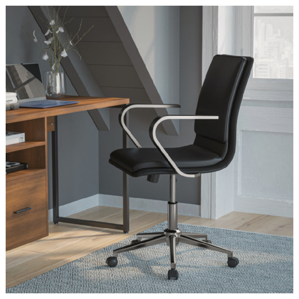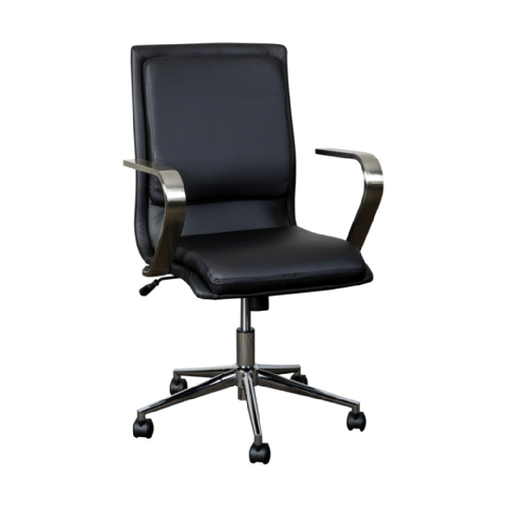 The Flash Furniture GO-21111B-BK-CHR-GG James Office Chair 18-21 3/4 Adjustable Seat Height is a versatile seating solution that caters to a variety of professional environments. Designed with a mid-back structure, this chair provides ample support while promoting an ergonomic posture, making it suitable for prolonged use in office settings. The seat height is adjustable from 18 inches to 21 3/4 inches, accommodating users of different heights for optimal comfort. It boasts a weight capacity of 300 pounds, ensuring durability and stability for a broad range of users. The LeatherSoft upholstery combines the luxurious feel of leather with the added durability of polyurethane, offering a plush seating experience. The solid wood seat is complemented by plush foam padding, enhancing comfort. Brushed chrome curved arms provide both style and support, while the brushed chrome base adds a sleek, modern touch. Equipped with pneumatic seat height adjustment and dual wheel casters, this chair allows for smooth mobility and easy customization to individual seating preferences. The black finish offers a sophisticated look that fits seamlessly into various office décors. Assembly is required, allowing for a straightforward setup to quickly integrate this chair into your workspace.