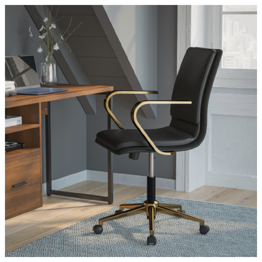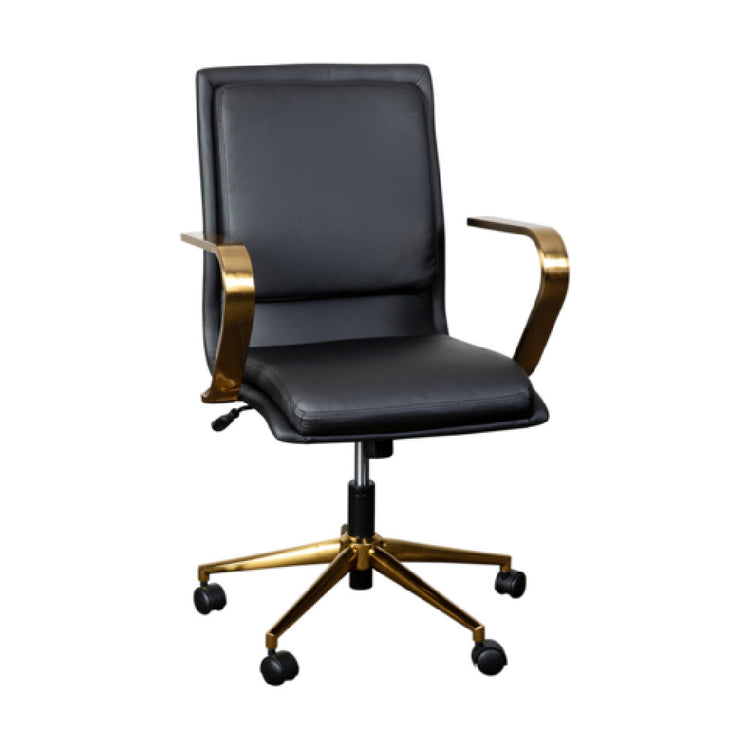 The Flash Furniture GO-21111B-BK-GLD-GG James Office Chair is a versatile seating solution tailored for diverse professional environments. With an adjustable seat height ranging from 18 to 21-3/4 inches, this chair accommodates varied desk heights and user preferences, enhancing ergonomic comfort. Capable of supporting up to 300 pounds, it features a sturdy mid-back design that promotes a healthy posture during extended work periods. The chair is upholstered in LeatherSoft, a blend of leather and polyurethane, which offers a soft, durable surface for enhanced comfort and longevity. The solid wood seat is complemented by plush foam padding, ensuring a comfortable experience. Additionally, the chair boasts brushed gold curved arms and a matching brushed gold base, adding a touch of elegance to any office setting. The pneumatic seat height adjustment allows for seamless customization, while dual wheel casters enable smooth mobility across office floors. This chair requires assembly, aligning with standard office furniture practices. The Flash Furniture GO-21111B-BK-GLD-GG James Office Chair combines function and style, making it an ideal choice for corporate offices, home workspaces, and creative environments seeking a blend of durability, comfort, and aesthetic appeal.