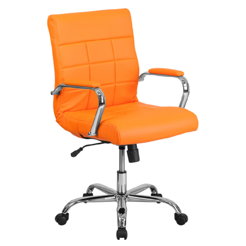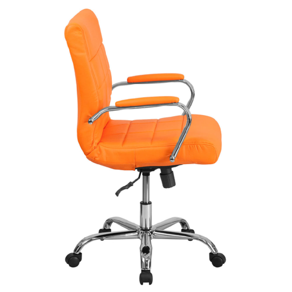 The Flash Furniture GO-2240-ORG-GG Executive Swivel Office Chair is a versatile seating solution designed to elevate comfort and style in any office environment. With an adjustable height range of 37 to 40 inches, this chair is engineered to accommodate a variety of body types and preferences, ensuring optimal ergonomic support. The chair supports a weight capacity of up to 250 lbs, reflecting its robust construction and durability. Its mid-back design, combined with a waterfall seat, enhances comfort by promoting better posture and reducing pressure on the legs. The vinyl upholstery with a quilted design adds a touch of sophistication, while the built-in lumbar support targets key areas of the lower back for enhanced comfort. For added functionality, the chair is equipped with a tilt lock mechanism and a tilt tension adjustment knob, allowing users to tailor the reclining experience. The padded chrome arms offer additional support and the CA117 fire retardant foam ensures safety. The chair's chrome base and dual-wheel casters provide stability and smooth mobility, making it suitable for dynamic office settings. Available in a vibrant orange, this chair not only meets aesthetic preferences but also complies with essential safety standards, making it a practical choice for varied professional environments.