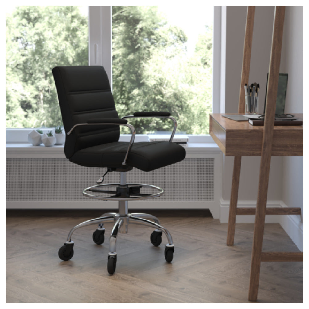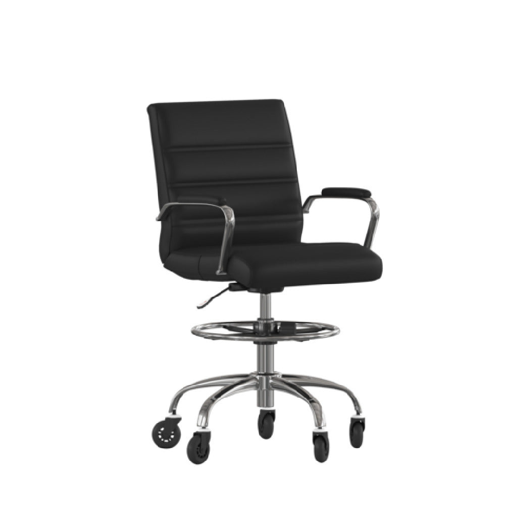 The Flash Furniture GO-2286B-BK-RLB-GG Lexi Drafting Chair is an exceptional office seating solution, meticulously crafted to cater to the needs of professionals who require both comfort and functionality in their workspace. With an adjustable seat height ranging from 22 inches to 30 inches, this chair accommodates a variety of working surfaces, making it ideal for architects, artists, and laboratory technicians. It boasts a mid-back design with LeatherSoft upholstery, which combines the durability of leather with the softness of fabric, ensuring a sophisticated look and feel. The ribbed design incorporates built-in lumbar support, promoting ergonomic seating and reducing strain during extended periods of use. Its padded arms add an extra layer of comfort, while the pneumatic seat height adjustment feature allows for seamless transitions between different tasks. The chair's adjustable foot ring provides additional support, enhancing posture and reducing fatigue. Supported by a sturdy chrome base, the chair can handle a weight capacity of up to 250 pounds. The poly roller style wheels ensure smooth mobility across various floor surfaces. Assembly is required, but the end result is a versatile and stylish seating option that meets the diverse needs of multiple industry professionals.
