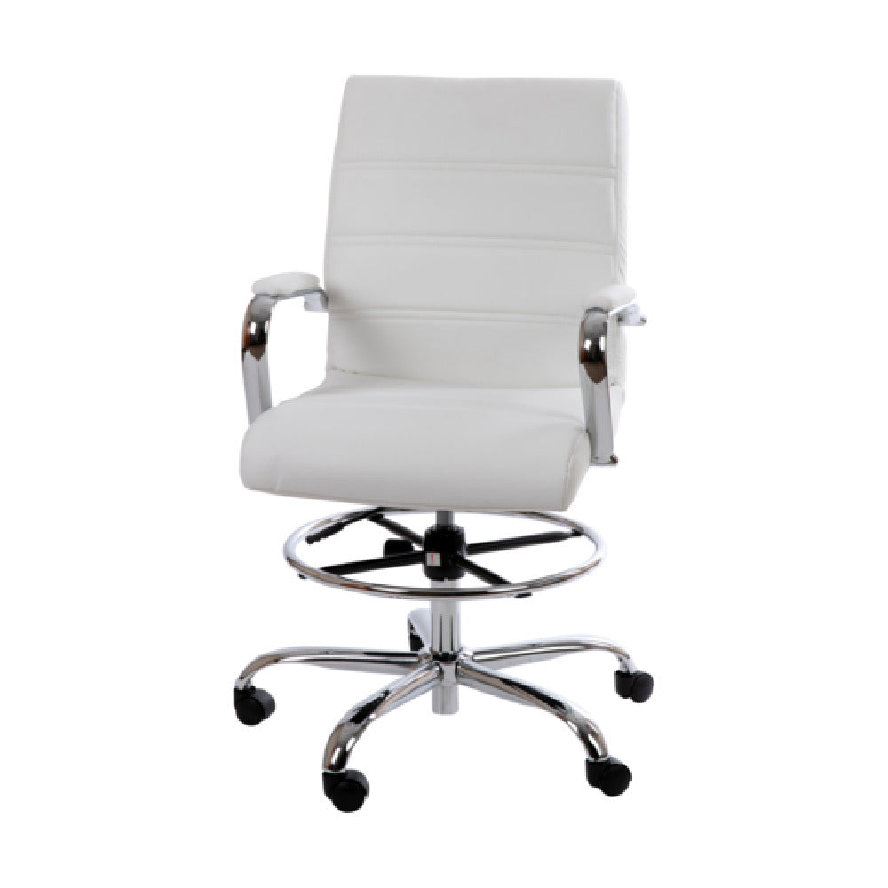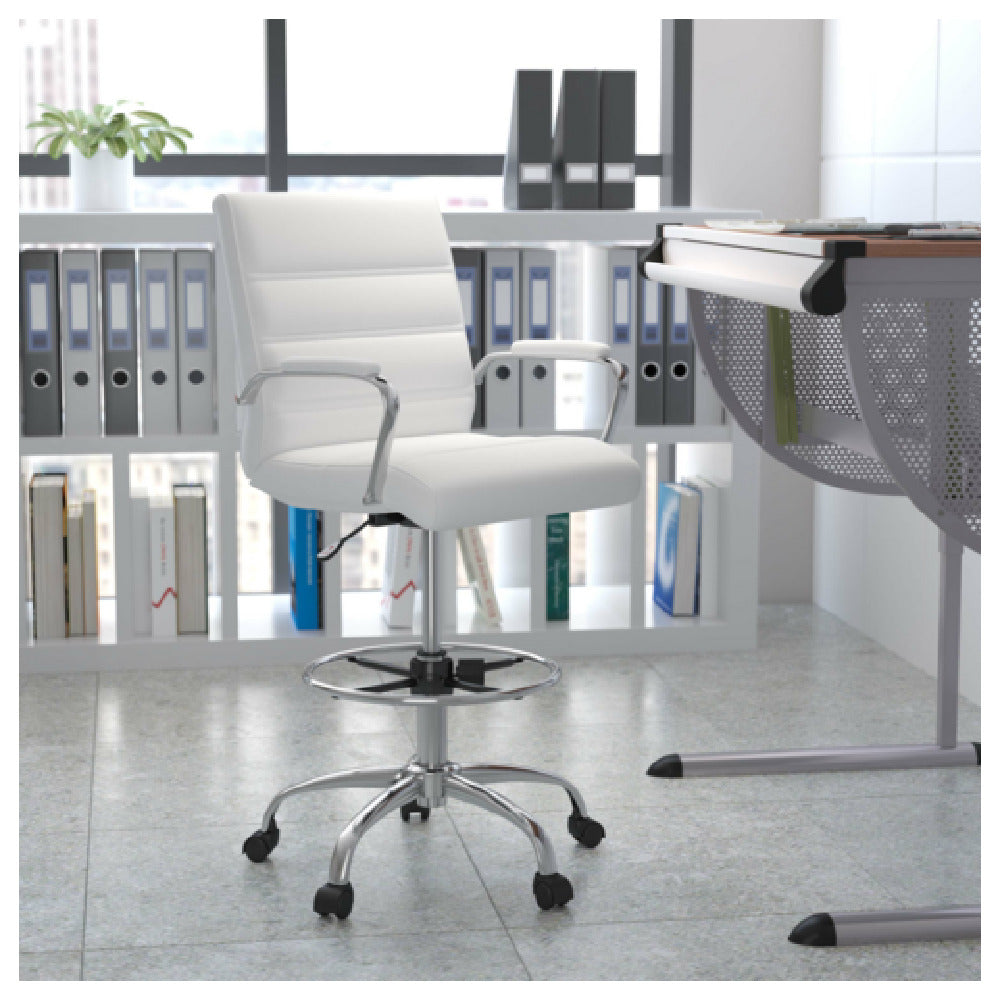 The Flash Furniture GO-2286B-WH-GG Whitney Drafting Chair 22" To 30" Adjustable Seat Height is a versatile seating solution designed for various professional environments that demand flexibility and comfort. This chair features a wide adjustable seat height range of 22 inches to 30 inches, accommodating a variety of desk heights and user preferences. With a weight capacity of 250 lbs, it suits a broad spectrum of users. The mid-back design offers support without restricting movement, while the LeatherSoft upholstery combines the durability of leather with the softness of fabric, complemented by ribbed detailing for a modern aesthetic. Built-in lumbar support and padded arms enhance comfort during prolonged use, which is critical in demanding work settings like architectural drafting or creative studios. Pneumatic seat height adjustment ensures ease of use, while the adjustable foot ring provides additional ergonomic support. The chair stands on a durable chrome base with dual-wheel casters, allowing smooth mobility across different floor types. Available in an elegant white finish, the Whitney Drafting Chair requires assembly upon delivery, making it a functional and stylish addition to any workspace where height adaptability and comfort are priorities.