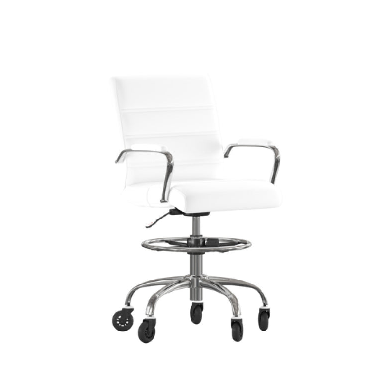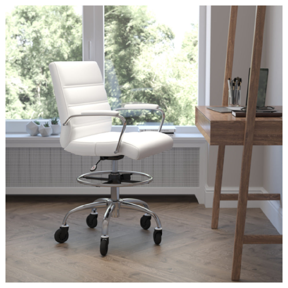 The Flash Furniture GO-2286B-WH-RLB-GG Lexi Drafting Chair 22" to 30" adjustable seat height is an ergonomic seating solution designed for flexibility and comfort, catering to various professional settings such as art studios, laboratories, and drafting environments. With a 250 lb. weight capacity, this chair provides robust support for a wide range of users. The mid-back design is complemented by LeatherSoft upholstery, which combines leather and polyurethane for added softness and durability, featuring a ribbed design that incorporates built-in lumbar support. This ensures a comfortable seating experience for extended periods. The padded arms provide additional comfort, while the pneumatic seat height adjustment allows the user to easily alter the seat between 22 and 30 inches to accommodate different work surfaces. An adjustable foot ring promotes proper posture by supporting the legs at various heights. The chrome base enhances the chair's aesthetic appeal and offers stability, while poly roller style wheels enable smooth movement across different floor surfaces. Available in white, the Lexi Drafting Chair requires assembly upon delivery, making it a practical and stylish choice for professionals in need of a versatile seating option.