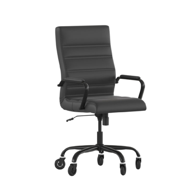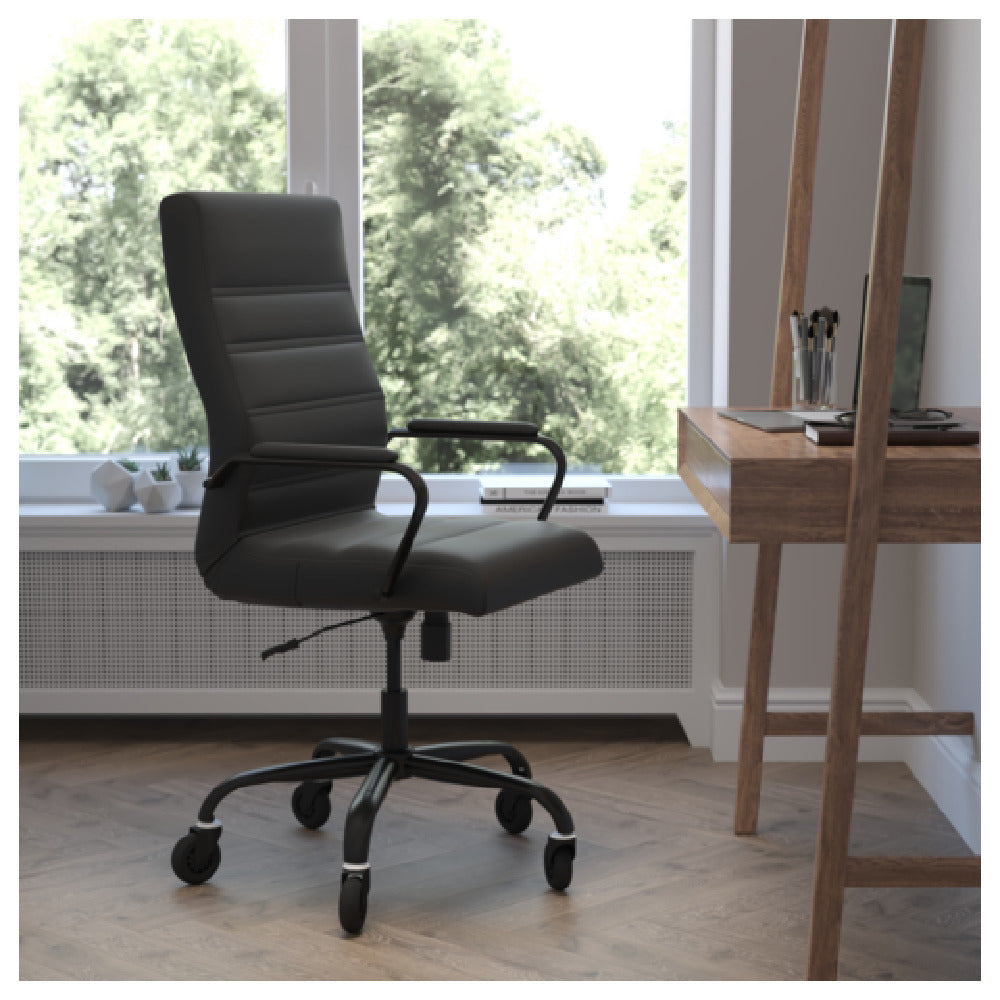 The Flash Furniture GO-2286H-BK-BK-RLB-GG Whiteney Executive Swivel Office Chair is designed to seamlessly blend ergonomic support with sophisticated style, making it highly suitable for various professional environments. With an adjustable height ranging from 39-1/4 inches to 43 inches, it caters to users' individual comfort preferences. The chair can support up to 250 pounds, ensuring durability for a broad spectrum of users. Its high back design and built-in lumbar support are tailored to enhance posture and alleviate strain during long working hours. The plush, LeatherSoft upholstery offers a luxurious feel while ensuring longevity. Featuring a waterfall seat, the chair promotes healthy circulation, reducing leg fatigue. The tilt lock mechanism and tilt tension adjustment knob provide personalized reclining angles, optimizing relaxation during breaks. Padded arms contribute additional comfort for the user. Safety is a priority, as demonstrated by the inclusion of CA117 fire retardant foam. The chair's black base and poly roller wheels facilitate smooth mobility across various floor surfaces. This product requires assembly, inviting users to engage directly with its thoughtful design. The Flash Furniture GO-2286H-BK-BK-RLB-GG is an exemplary choice for executives seeking a balance of comfort, style, and functionality in an office chair.