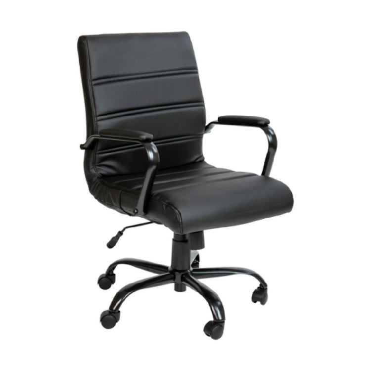 Flash Furniture GO-2286M-BK-BK-GG Whitney Executive Swivel Office Chair is designed with both comfort and style in mind, adjusting from 37 to 40-3/4 inches in height to accommodate a range of users. This chair features a sturdy mid-back design, making it suitable for long hours of use in professional environments. Its LeatherSoft upholstery combines leather and polyurethane for added softness and durability, providing a luxurious seating experience. Equipped with a waterfall seat, it promotes better circulation by reducing pressure on the legs, which is ideal for office settings. The chair's built-in lumbar support enhances comfort by supporting the lower back, crucial for maintaining proper posture during prolonged periods of sitting. The tilt lock mechanism and tilt tension adjustment knob allow users to customize the chair’s recline and ease of movement, catering to diverse preferences in different market segments. With a 250 lb. weight capacity, it is robust enough for various user needs. Black padded arms add an extra layer of comfort, while the dual wheel casters ensure easy mobility across multiple surfaces. The chair’s CA117 fire retardant foam provides safety, and the black base contributes to its sleek, professional appearance, making assembly a worthwhile endeavor for various industry sectors.