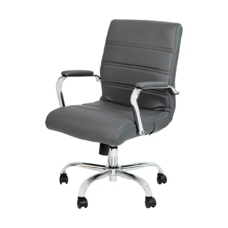 The Flash Furniture GO-2286M-GR-GG Whitney Executive Swivel Office Chair is a versatile piece suitable for various office environments, offering an adjustable height range from 37 to 40-3/4 inches. Engineered with a mid-back design, this chair ensures comfort through its LeatherSoft upholstery, combining both leather and polyurethane for added softness and durability. Its built-in lumbar support is specifically designed to promote healthy posture during extended periods of sitting. The chair accommodates a weight capacity of up to 250 pounds, ensuring robust support for a wide range of users. Key features include a waterfall seat that helps reduce pressure on the legs, a tilt lock mechanism for customizable recline, and a tilt tension adjustment knob tailored to suit individual comfort preferences. The chair's padded arms provide additional support, while the CA117 fire retardant foam underscores its safety credentials. This executive chair is also equipped with a chrome base and dual wheel casters for smooth mobility across various floor types. Assembly is required. The elegant gray color complements modern office aesthetics, making it a prime choice for professionals seeking both functionality and style in their workspace seating solutions.