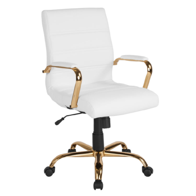 Flash Furniture GO-2286M-WH-GLD-GG Whitney Executive Swivel Office Chair 37" to 40-3/4" Adjustable Height is a sophisticated seating solution designed for various professional settings. This chair features a 250 lb. weight capacity and a mid-back design, making it suitable for a wide range of users. The waterfall seat is upholstered in LeatherSoft, a blend of leather and polyurethane, providing a soft yet durable surface. Ergonomically designed, it includes built-in lumbar support to enhance comfort during extended work sessions. The chair's adjustability is a key feature, with a height range of 37" to 40-3/4" and a tilt lock mechanism complemented by a tilt tension adjustment knob, allowing customization to individual preferences. Aesthetically, the chair boasts gold padded arms and a gold base, adding a touch of elegance to its functional design. The dual wheel casters ensure smooth mobility across office floors. Safety is prioritized with CA117 fire retardant foam. While assembly is required, the end result is a stylish and practical office chair that caters to executive offices, home workspaces, and collaborative environments looking to balance comfort, durability, and visual appeal.