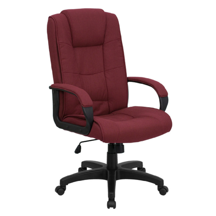 Flash Furniture GO-5301B-BY-GG Executive Swivel Office Chair 44" to 48" Adjustable Height is a versatile seating solution designed for modern workspaces, offering a blend of comfort and functionality. This executive chair features a high back design with a headrest and built-in lumbar support, ensuring ergonomic support for extended periods of sitting. The chair's adjustable height ranges from 44" to 48", accommodating various desk heights and user preferences. Upholstered in fabric, it combines style and durability, while its padded arms add an extra layer of comfort. The chair's 250 lb. weight capacity reflects its robust construction, supported by a heavy-duty black nylon base. For mobility and stability, it is equipped with dual wheel casters. Its tilt lock mechanism and tilt tension adjustment knob allow users to customize their seating angle, contributing to a personalized sitting experience. Safety is considered with CA117 fire retardant foam used in its construction. Available in a burgundy finish, this chair requires assembly upon delivery. With in-stock items typically shipping within 24 hours, this executive swivel chair is a practical choice for corporate offices, home workspaces, and executive suites, accommodating the needs of professionals who prioritize both comfort and style in their seating arrangements.