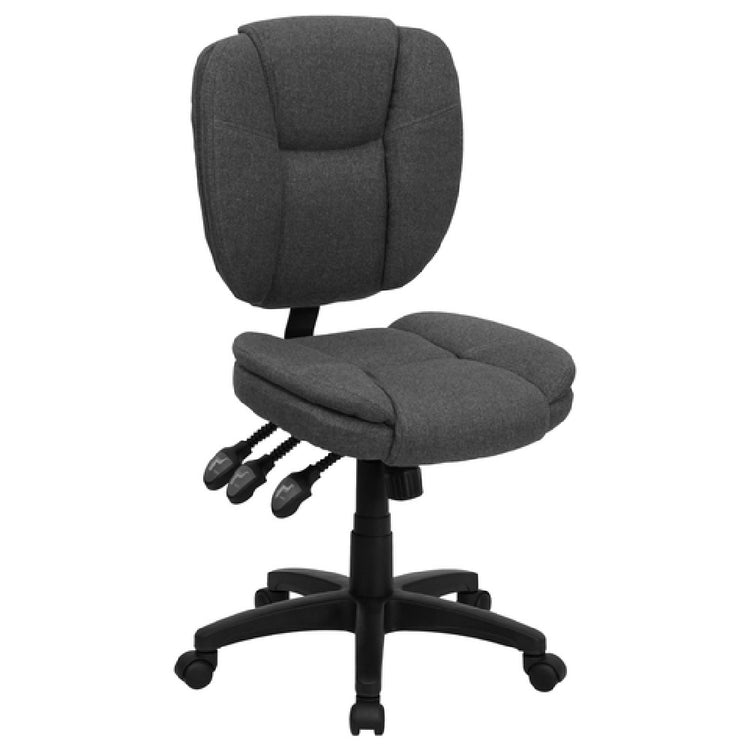 The Flash Furniture GO-930F-GY-GG Ergonomic Swivel Task Chair - 35" to 41" adjustable height - is a versatile seating solution designed for diverse work environments. With a 250 lb. weight capacity and a multi-functional, mid-back design, this chair caters to various professional needs. The pillow top cushioned back and waterfall seat provide enhanced comfort, while the fabric upholstery adds a touch of elegance to any office space. This chair features a triple paddle control mechanism, allowing for precise adjustments: the 2-3/4" adjustable height back, infinite-locking back angle adjustment, and 2-to-1 Synchro tilt adjustment ensure a customizable seating experience. The tilt tension adjustment knob provides additional control over the reclining resistance. Notably, this model is armless, promoting flexibility of movement. Safety and durability are prioritized, as evidenced by the CA117 fire retardant foam and the heavy-duty black nylon base. Dual wheel casters offer smooth mobility across various floor surfaces. The chair's sleek gray color seamlessly integrates into modern office settings. Available for quick shipping, assembly is required for setup. This ergonomic task chair is an excellent choice for offices seeking comfort, adjustability, and reliability in seating options.