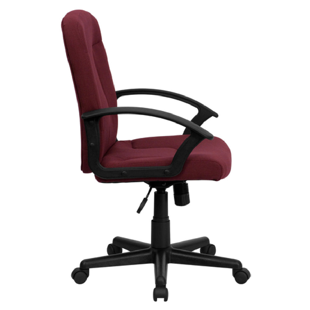 The Flash Furniture GO-ST-6-BY-GG Executive Swivel Office Chair is an ergonomically designed seating solution ideal for various professional environments. With an adjustable height range of 36-1/4" to 40-1/2" and a robust weight capacity of 250 lbs, this chair accommodates a wide range of users. Its mid-back design and fabric upholstery provide comfort and support during extended periods of sitting. Featuring a tilt lock mechanism and a tilt tension adjustment knob, it allows users to customize their seating angle and resistance to suit personal preferences. The chair is equipped with durable nylon arms and a heavy-duty black nylon base that enhances its stability and longevity. Additionally, the dual wheel casters enable smooth mobility across different floor surfaces. Safety is prioritized with the inclusion of CA117 fire retardant foam, ensuring peace of mind in compliance with fire safety standards. Available in a sophisticated burgundy color, this chair requires assembly upon delivery. Typically, in-stock items ship within 24 hours, making it a convenient option for businesses and home offices seeking a reliable and stylish seating solution. The Flash Furniture GO-ST-6-BY-GG Chair is the perfect blend of functionality, safety, and aesthetic appeal, catering to diverse needs in the office furniture market.