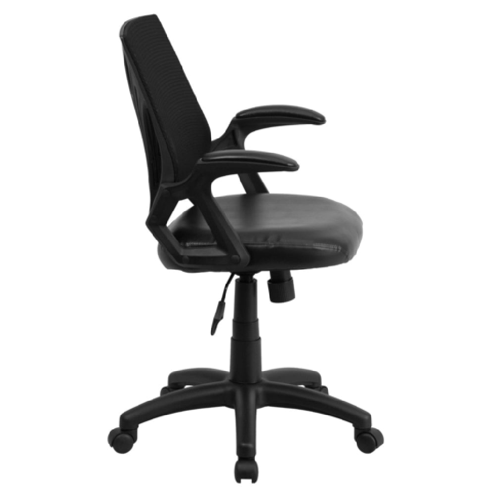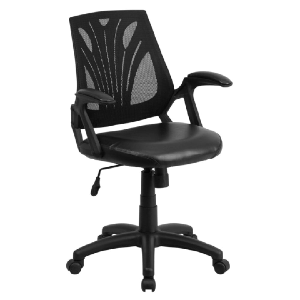 The Flash Furniture GO-WY-82-LEA-GG Swivel Task Chair 35-1/4" to 39" Adjustable Height is a versatile seating solution designed to cater to diverse office environments. This chair features a mid-back design and a mesh back, ensuring breathability and comfort during extended use. The padded LeatherSoft upholstered waterfall seat enhances seating comfort while promoting healthier circulation. With an adjustable height range from 35-1/4" to 39", it accommodates users of varying statures, supporting a weight capacity of up to 250 lbs. Built-in lumbar support provides ergonomic benefits, promoting proper posture. The chair includes a tilt lock mechanism and a tilt tension adjustment knob, allowing users to customize their seating position. Padded arms add an extra layer of comfort, making it suitable for prolonged use. Constructed with CA117 fire retardant foam, this chair prioritizes safety along with convenience. It features a heavy-duty black nylon base and dual wheel casters, ensuring stability and ease of movement across different floor types. Available in black, this task chair requires assembly upon delivery, with in-stock items typically shipping within 24 hours. Whether in a corporate setting or home office, this chair offers a balance of functionality and style, meeting the needs of various professional spaces.