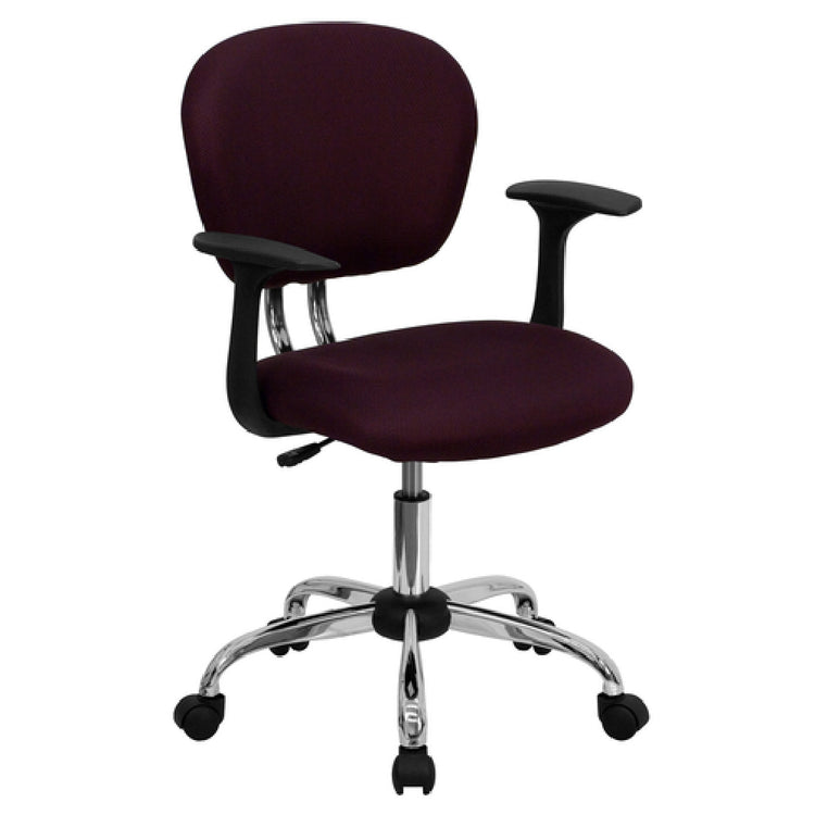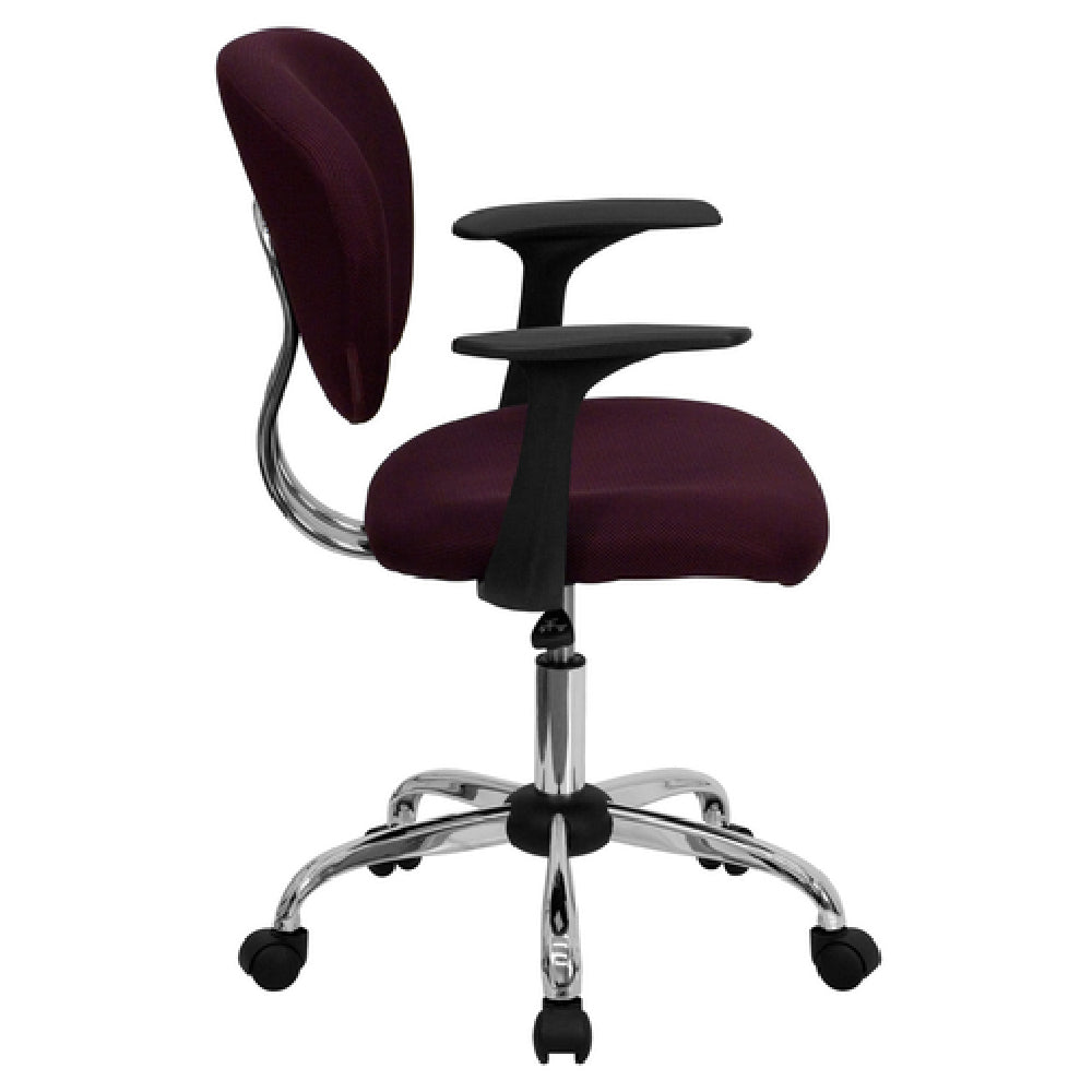 The Flash Furniture H-2376-F-BY-ARMS-GG Swivel Task Chair 33-1/2" To 37-1/2" Adjustable Height stands out in the world of office seating with its blend of ergonomic design and robust functionality, perfect for various professional environments. This mid-back chair offers a height range from 33-1/2" to 37-1/2", accommodating different desk heights and user preferences. Its padded mesh upholstered seat and back provide comfort and breathability, an essential feature for extended use. The nylon arms offer additional support, while the heavy-duty chrome base ensures stability for users up to a weight capacity of 250 lb. Equipped with dual wheel casters, this chair provides smooth mobility, making it ideal for dynamic workspaces. The inclusion of CA117 fire retardant foam adds a layer of safety, adhering to fire safety standards. The burgundy color adds a touch of elegance, complementing various office decors. Assembly is required, but the straightforward process means the chair can be ready for use quickly. Typically, in-stock items ship within 24 hours, ensuring speedy delivery for businesses in need of rapid setup. The Flash Furniture Swivel Task Chair combines practicality, comfort, and style, making it an appealing choice for multiple market segments within the professional industry.