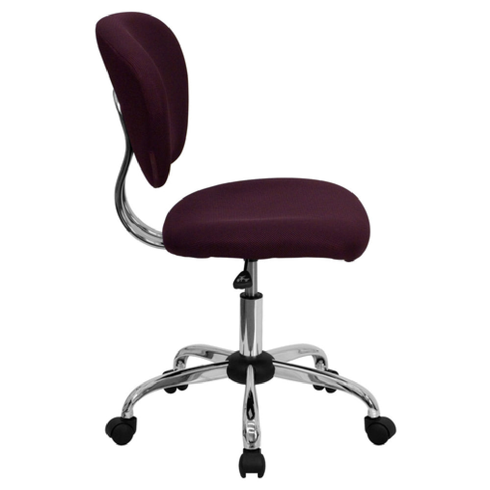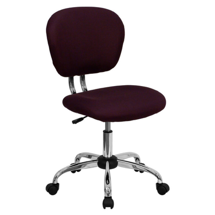 The Flash Furniture H-2376-F-BY-GG Swivel Task Chair Adjustable Height 250 Lb. Weight Capacity is a versatile seating solution designed for diverse professional environments. This chair features a mid-back design that supports the natural curve of the spine, promoting ergonomic comfort during extended periods of sitting. It is upholstered with a padded mesh seat and back, providing breathability and comfort. The chair's adjustable height feature ensures it can cater to various desk heights and user preferences, making it suitable for multiple office settings. Supporting a weight capacity of up to 250 lbs., this task chair accommodates a wide range of users. The chair's base is constructed from heavy-duty chrome, enhancing durability and stability, while the dual wheel casters facilitate smooth movement across different floor types. The chair is designed without arms, offering users free range of motion, which can be particularly beneficial in dynamic workspaces. Safety is a priority, as the chair incorporates CA117 fire retardant foam, ensuring compliance with fire safety standards. The chair's rich burgundy color adds a sophisticated touch to any office decor. Assembly is required, and in-stock items typically ship within 24 hours, ensuring quick availability for business needs.