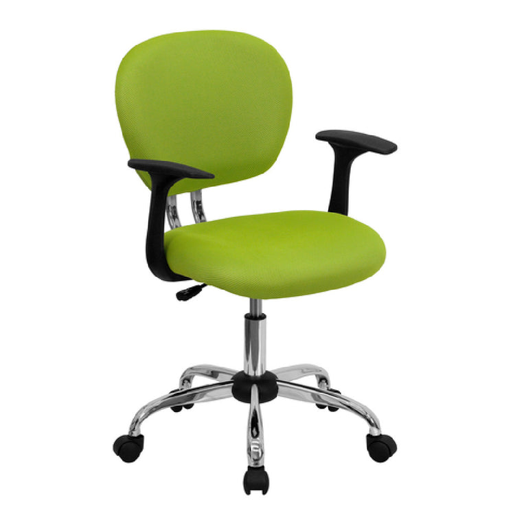 The Flash Furniture H-2376-F-GN-ARMS-GG Swivel Task Chair 33-1/2" to 37-1/2" Adjustable Height is a versatile seating solution designed for diverse workplace environments. This chair accommodates users with its adjustable height range of 33-1/2 inches to 37-1/2 inches, providing ergonomic comfort tailored to individual needs. The mid-back design coupled with a padded mesh upholstered seat and back enhances breathability and support, making it ideal for prolonged use. With a weight capacity of 250 pounds, this task chair is robust enough for various office scenarios. Its nylon arms contribute to a comfortable seating experience, while the CA117 fire retardant foam ensures safety and compliance with fire safety standards. The chair's heavy-duty chrome base not only adds a touch of elegance but also assures stability and durability. Equipped with dual wheel casters, it offers smooth mobility across different floor types, enhancing productivity in dynamic office settings. The apple green color adds a vibrant aesthetic, bringing a modern look to any office decor. Although assembly is required, the product is in stock and usually ships within 24 hours, ensuring a quick setup. This chair is perfectly suited for home offices, corporate workspaces, or any setting that values both functionality and style.