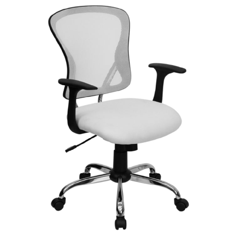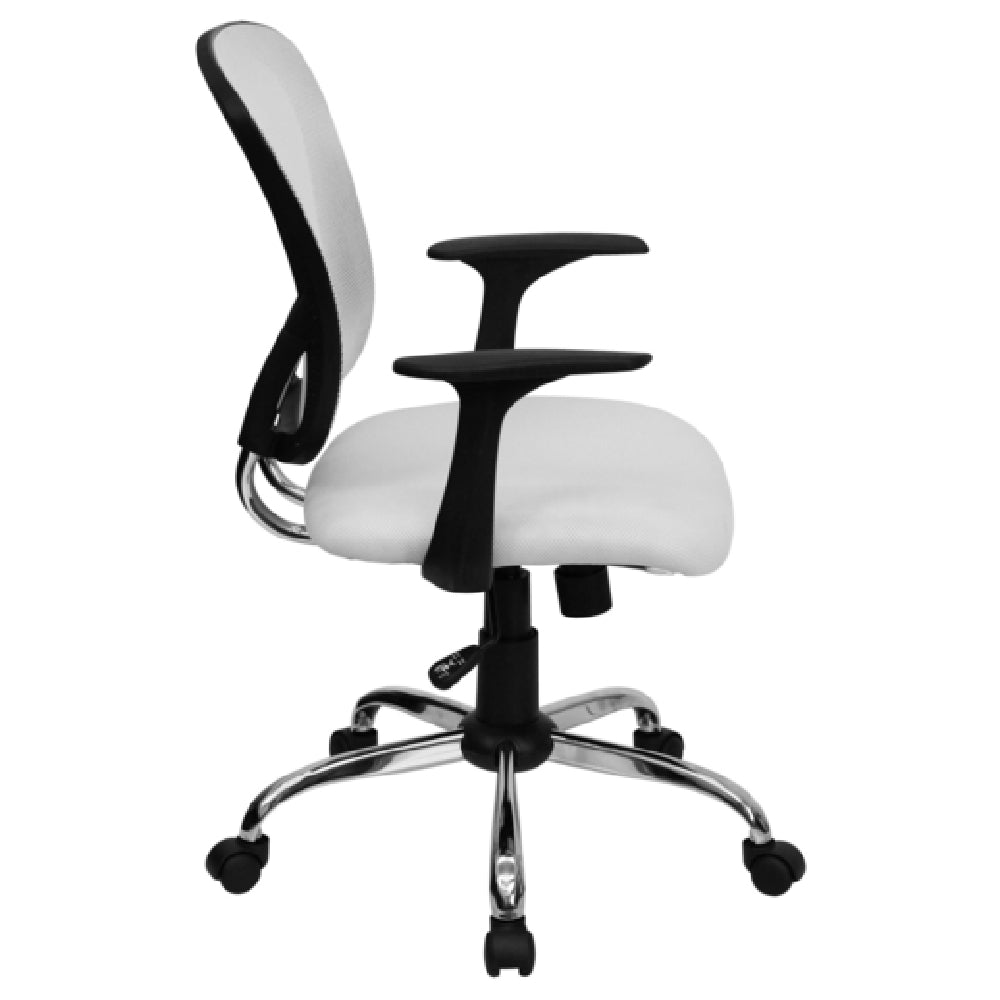 The Flash Furniture H-8369F-WHT-GG Swivel Task/Office Chair is a versatile seating solution designed to accommodate the needs of various professional environments. With an adjustable height ranging from 36 inches to 40 inches, it caters to users seeking customizable comfort. This chair supports individuals weighing up to 250 pounds, thanks to its robust construction. The mid-back design features a ventilated mesh back that promotes airflow, ensuring comfort during extended use. The padded mesh upholstered waterfall seat enhances ergonomic support, further complemented by built-in lumbar support for optimal posture. The tilt lock mechanism and tilt tension adjustment knob allow users to tailor their seating experience to personal preferences. Integrated nylon arms add durability and support, while the heavy-duty chrome base provides stability. Dual wheel casters facilitate smooth movement across various flooring surfaces. Additionally, the chair incorporates CA117 fire retardant foam, enhancing safety standards. Available in white, it requires assembly upon delivery. In-stock items typically ship within 24 hours, making the Flash Furniture H-8369F-WHT-GG a practical choice for those in need of prompt solutions. This chair is well-suited for office settings, home workspaces, and other environments where ergonomic seating is a priority.