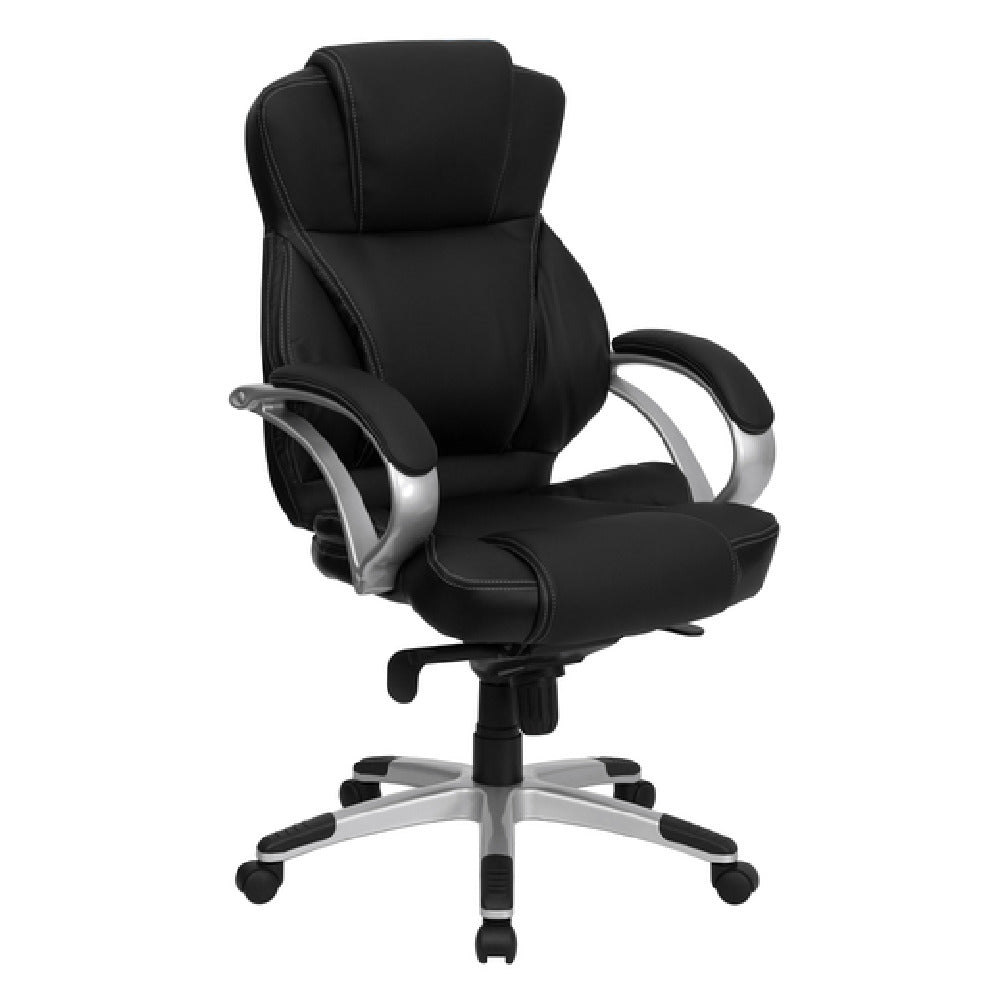 The Flash Furniture H-9626L-2-GG Contemporary Executive Swivel Office Chair is a meticulously designed seating solution, perfect for professionals seeking comfort and style. This chair boasts a high back design with a contoured seat and back, integrating a headrest for enhanced ergonomics. The chair's adjustable height ranges from 44 inches to 47 inches, catering to various desk heights and user preferences. Its robust construction supports a weight capacity of up to 250 lb, ensuring durability for different body types. Upholstered in LeatherSoft, a blend of leather and polyurethane, it offers supreme softness and durability, complemented by contrasting white stitching for a modern aesthetic. Built-in lumbar support and a tilt lock mechanism with a tilt tension adjustment knob provide customizable comfort, ideal for long hours of sitting. Padded arms add to the chair's ergonomic benefits, while the CA117 fire retardant foam enhances safety standards. The chair's heavy-duty silver nylon capped metal base with black end caps ensures stability, and dual wheel casters facilitate easy mobility across different flooring types. Available in black, this chair requires assembly and is usually ready to ship within 24 hours, making it a convenient choice for corporate and home office environments.