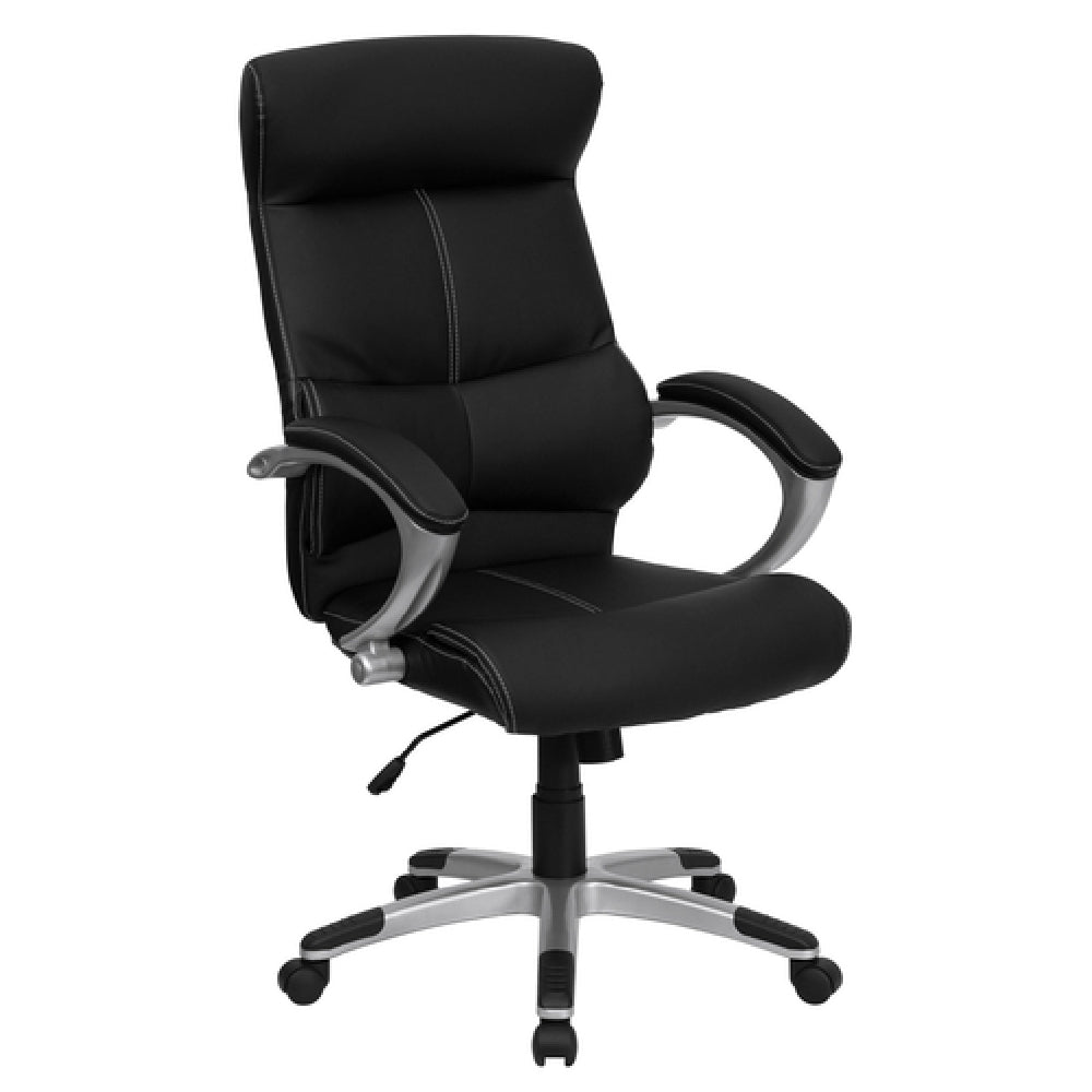 The Flash Furniture H-9637L-1C-HIGH-GG Executive Swivel Office Chair, with an adjustable height range of 46-1/4" to 50", is engineered for optimal comfort and support, making it a prime choice for the executive office environment. Its high back design and contoured seat and back, complete with a headrest, are crafted to provide ergonomic support, essential for long hours of work. The chair features LeatherSoft upholstery, known for its softness and durability, accented with contrasting white stitching for a sophisticated look. A built-in lumbar support system complements the user’s posture, reducing strain during extended use. The tilt lock mechanism and tilt tension adjustment knob allow for personalized seating positions, further enhancing comfort. Padded arms add to the luxury and ease of use. Safety and durability are ensured with CA117 fire retardant foam and a heavy-duty silver nylon capped metal base with black end caps, supporting up to 250 lbs. Dual wheel casters provide smooth mobility. This chair requires assembly but delivers exceptional value through its combination of design, functionality, and robust construction, meeting the diverse demands of professional settings.