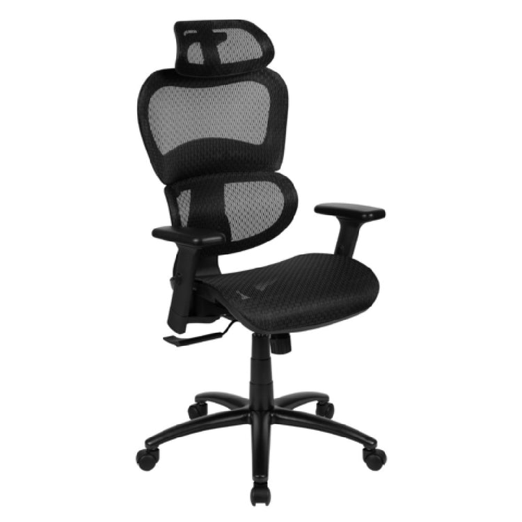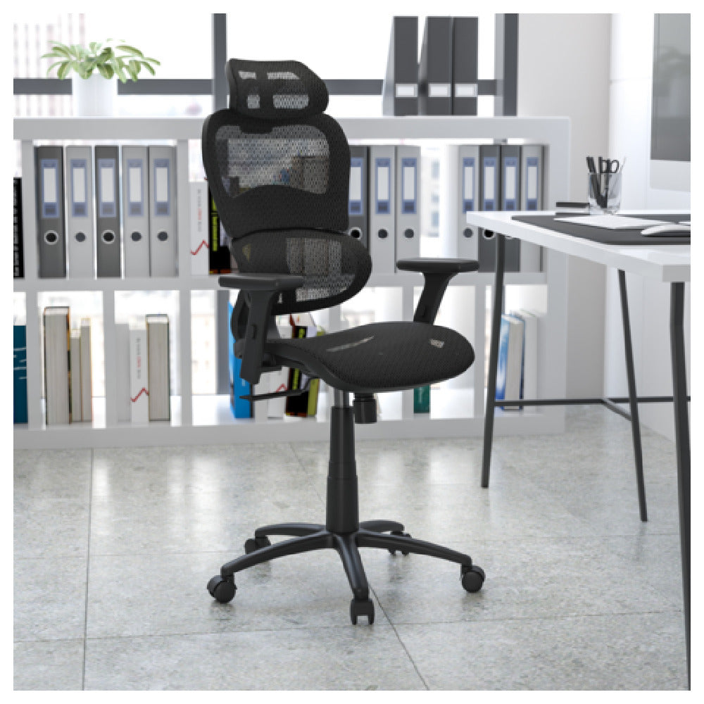 The Flash Furniture H-LC-1388F-1K-BK-GG LO Office Chair is a meticulously designed seating solution tailored for diverse professional environments, featuring an 18-1/2" to 22-1/2" adjustable seat height that caters to various ergonomic needs. With a substantial weight capacity of 250 lbs., this office chair ensures robust support and comfort throughout extended use. Its high back design and adjustable headrest provide enhanced ergonomic support, promoting proper posture and reducing strain. The chair's mesh back and seat facilitate excellent breathability, contributing to user comfort during long work hours. Built-in lumbar support further enhances the chair's ergonomic benefits by supporting the lower back. The 2-to-a locking synchro tilt adjustment and tilt tension adjustment knob allow for customized reclining preferences, ensuring maximum comfort. Height adjustable arms cater to individual arm positioning needs, while the durable nylon base and dual wheel casters ensure stable mobility. Available in classic black, this chair requires assembly upon delivery. The Flash Furniture H-LC-1388F-1K-BK-GG LO Office Chair combines functionality with ergonomic design, making it an ideal choice for various office settings, from corporate environments to home offices, where user comfort and adaptable features are paramount.