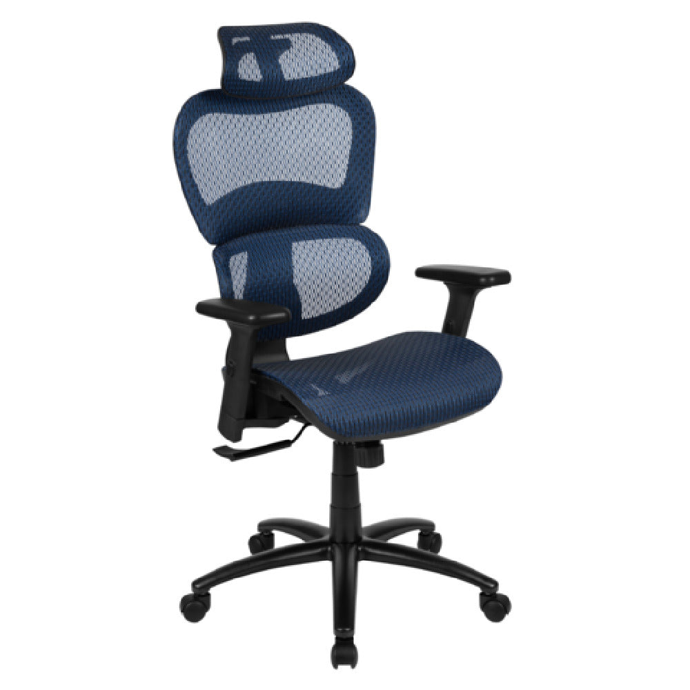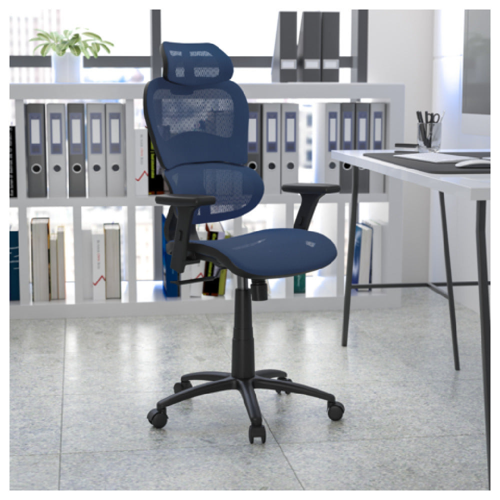 The Flash Furniture H-LC-1388F-1K-BL-GG LO Office Chair 18-1/2" to 22-1/2" Adjustable Seat Height stands out in the realm of office seating with its thoughtful design and technical features. This chair accommodates users up to 250 lbs and offers a high back design that promotes comfort during prolonged use. It includes an adjustable headrest and built-in lumbar support, catering to ergonomic needs. The mesh back and seat provide breathability, helping maintain comfort throughout the day. For adaptability, the chair incorporates a 2-to-a locking synchro tilt adjustment and a tilt tension adjustment knob, allowing users to find their preferred seating angle. Height adjustable arms add another layer of customization, ensuring it meets the unique needs of different users. Built on a durable nylon base with dual wheel casters, this chair offers stability and ease of movement across various floor types. Available in a vibrant blue color, and requiring assembly, the Flash Furniture H-LC-1388F-1K-BL-GG is a versatile seating solution for modern offices, providing a balance of style, comfort, and functionality for users in diverse professional settings.