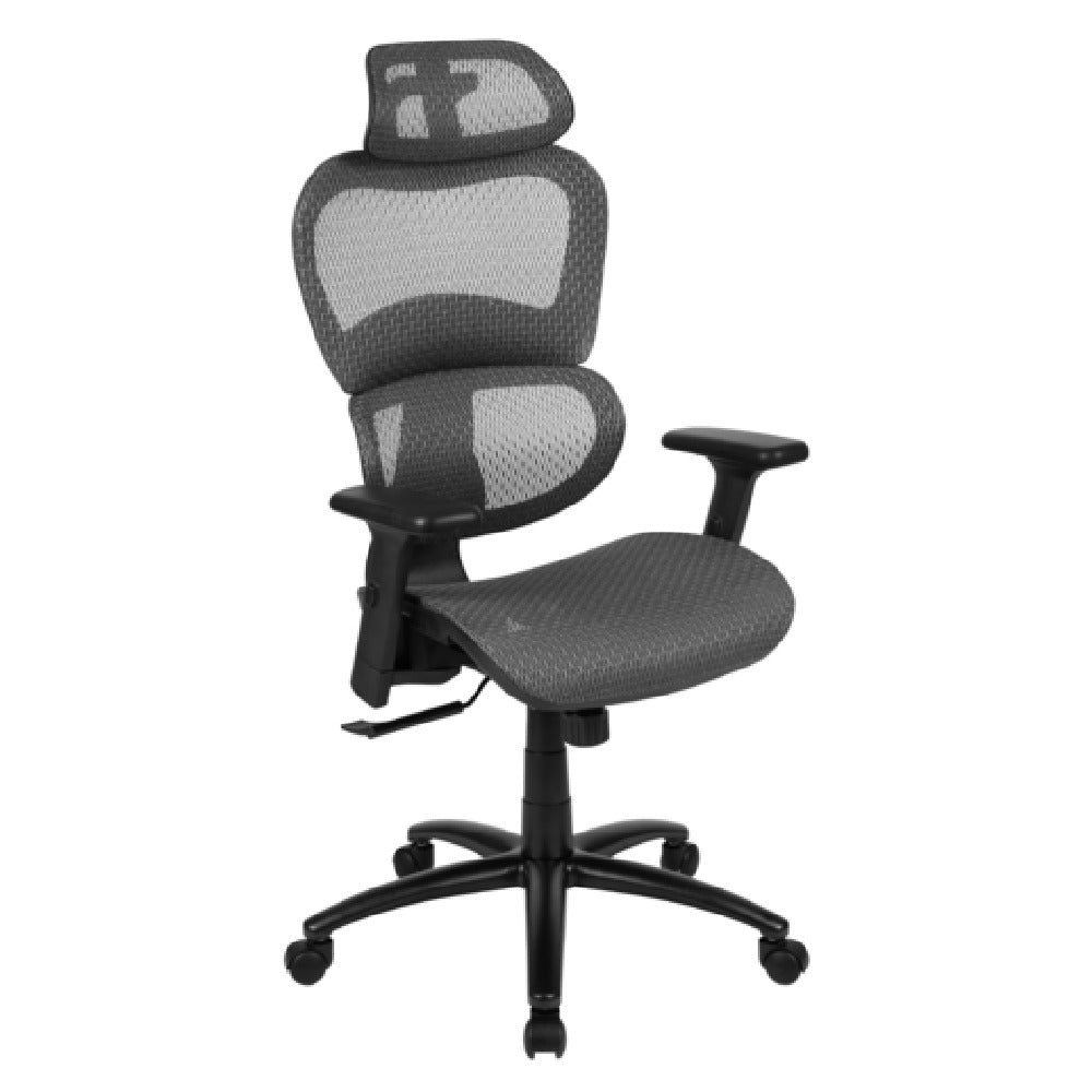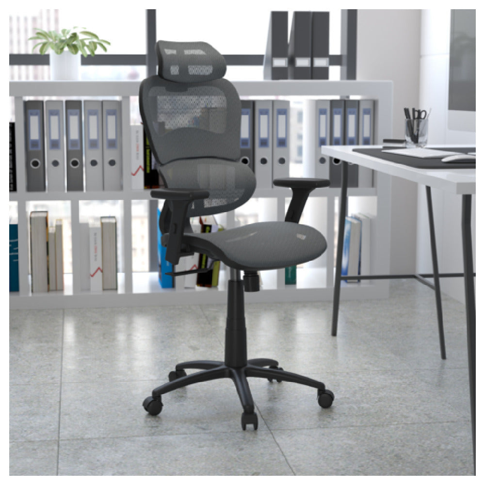 Flash Furniture H-LC-1388F-1K-GY-GG LO Office Chair 18-1/2" to 22-1/2" Adjustable Seat Height is a versatile seating solution designed for various professional environments. This office chair boasts an adjustable seat height ranging from 18-1/2" to 22-1/2", catering to different user preferences and desk heights. It supports a weight capacity of up to 250 pounds, ensuring reliability and durability for diverse user needs. The high back design, coupled with an adjustable headrest, provides enhanced comfort and ergonomic support, making it suitable for prolonged use. The mesh back and seat promote air circulation, contributing to a cooler seating experience. Integrated lumbar support aids in maintaining proper posture, reducing fatigue during extended work hours. This chair features a 2-to-a locking synchro tilt adjustment and a tilt tension adjustment knob, allowing users to customize their seating position for optimal comfort. The height adjustable arms accommodate various arm lengths and desk heights, enhancing user comfort. A sturdy nylon base and dual wheel casters provide smooth mobility and stability, making this chair a practical choice for modern office settings. Assembly is required, and the chair is available in a sleek gray finish.
