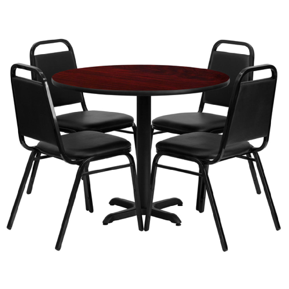 The Flash Furniture HDBF1002-GG Table and Banquet Chair Set is a meticulously designed furniture ensemble, ideal for both commercial and residential settings. This set includes a round table measuring 36" in diameter and 30" in height, featuring a black T-mold edge and a sturdy MDF construction with a high impact melamine core. The table is elegantly finished with a mahogany laminate and supported by a robust cast iron x-base with a black powder-coated finish. Complementing the table are four banquet chairs, each with a width of 17-1/2", a depth of 20-1/4", and a height of 34". These chairs boast a substantial 500 lb. weight capacity, making them suitable for various seating requirements. They are equipped with trapezoidal seamless back panels, vinyl upholstered seats and backs, and 1-1/2" thick CA117 fire retardant foam for enhanced safety and durability. The chairs' construction is reinforced with double support braces and a 16 gauge steel frame, featuring a black powder-coated finish and plastic floor glides for added stability and floor protection. This set is shipped in four boxes and typically arrives within 1-2 business days, delivering both style and functionality to any dining space.