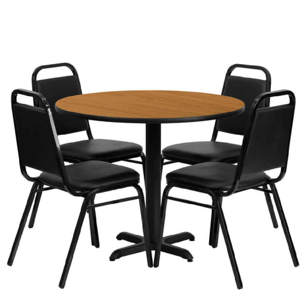 The Flash Furniture HDBF1003-GG Table and Banquet Chair Set is a versatile furniture solution designed for both commercial and residential settings, featuring a 36-inch diameter, 30-inch high round table with a black T-mold edge and a high-impact melamine core. The table is finished with a natural laminate and supported by a robust cast iron X-base, coated in a durable black powder finish. Complementing the table are four banquet chairs, each measuring 17-1/2 inches in width, 20-1/4 inches in depth, and 34 inches in height, capable of supporting up to 500 pounds. These chairs feature a trapezoidal seamless back panel and are upholstered with vinyl, providing a comfortable seating experience with 1-1/2 inch thick CA117 fire retardant foam. Additionally, the chairs are reinforced with double support braces and include plastic bumper guards and floor glides, all supported by a 16-gauge steel frame with a black powder coated finish. Designed with practicality in mind, this set is shipped in four boxes and requires assembly, with an efficient lead time of 1-2 business days. The Flash Furniture HDBF1003-GG set is an exceptional choice for hosting events, meetings, or enhancing any dining space with its durable construction and elegant design.
