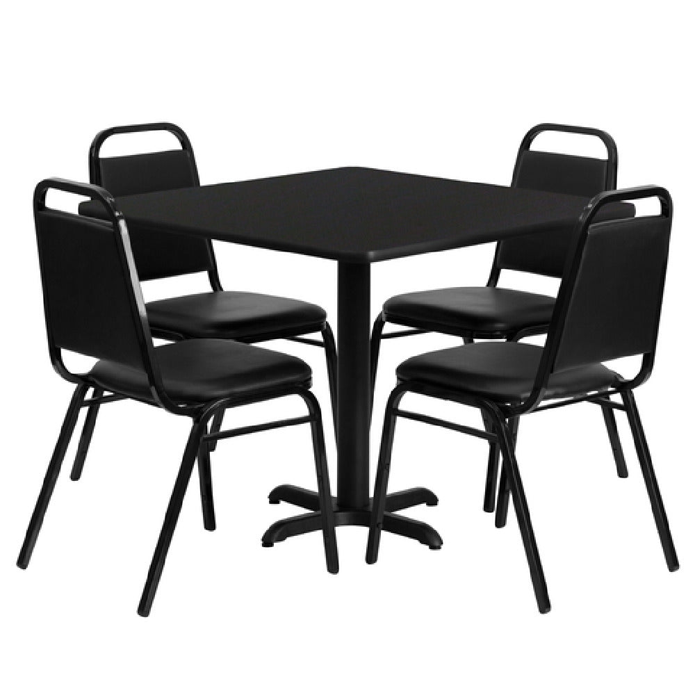 The Flash Furniture HDBF1009-GG Table and Banquet Chair Set is a comprehensive dining solution that seamlessly blends functionality and style. Featuring a square table measuring 36 inches in width, 36 inches in depth, and 30 inches in height, this set is designed to meet both commercial and residential needs. The table boasts a durable black T-mold edge and an MDF core with a high-impact melamine surface, finished in a sleek black laminate. Its sturdy cast iron x-base is coated with a black powder finish, ensuring long-lasting durability. Accompanying the table are four banquet chairs, each with dimensions of 17-1/2 inches in width, 20-1/4 inches in depth, and 34 inches in height. These chairs are built to support up to 500 pounds, featuring a trapezoidal seamless back panel and black vinyl upholstery for comfort and style. The 1-1/2 inch thick CA117 fire retardant foam provides added safety, while double support braces enhance stability. A 16 gauge steel frame with a black powder-coated finish and plastic bumper guards ensures these chairs can withstand rigorous use. Designed for easy assembly, this set is shipped in four boxes and typically arrives within 1-2 business days, making it a versatile choice for various market segments.