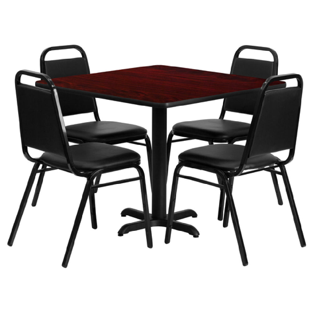 The Flash Furniture HDBF1010-GG Table and Banquet Chair Set is a versatile offering, ideal for both commercial and residential settings. This set includes a 36"W x 36"D x 30"H square table, featuring a sturdy black T-mold edge and a high-impact melamine core. The table is enhanced with a mahogany laminate finish and is supported by a durable cast iron x-base with a sleek black powder-coated finish. Accompanying the table are four banquet chairs, each measuring 17-1/2"W x 20-1/4"D x 34"H, with an impressive weight capacity of 500 lbs. The chairs boast a trapezoidal seamless back panel and are upholstered in black vinyl, providing both style and comfort. The seating is further supported by 1-1/2" thick CA117 fire retardant foam, double support braces, and a 16-gauge steel frame with a matching black powder-coated finish. Plastic bumper guards and floor glides protect floors during use, making these chairs both practical and reliable. This set is shipped in four boxes, requiring assembly upon arrival, with a lead time of 1-2 business days. Designed to meet the demands of high-traffic environments, this set seamlessly combines durability and aesthetic appeal.