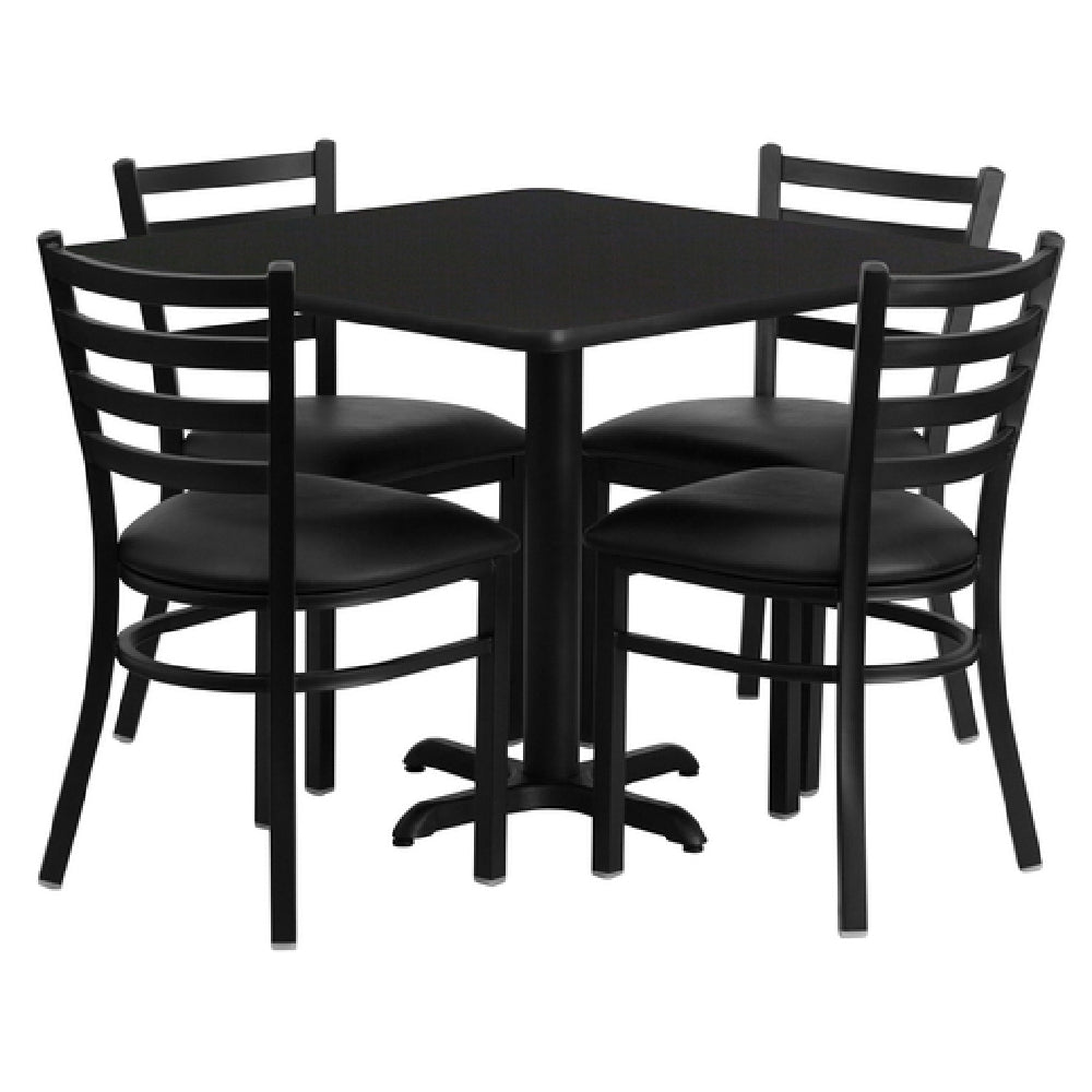 Flash Furniture HDBF1013-GG Table And Chair Set is a comprehensive furniture solution that includes a square table and four chairs, designed to meet the needs of both residential and commercial environments. The table measures 36"W x 36"D x 30"H and features a black T-mold edge with a sturdy MDF construction and a high-impact melamine core. Its black laminate finish and cast iron x-base with a black powder-coated finish provide both durability and a sleek aesthetic. The chairs measure 16-1/2"W x 17"D x 32-1/4"H and are equipped with metal ladder backs. They offer comfort with black vinyl upholstered padded seats, featuring 2-1/2" thick CA117 fire retardant foam. The chairs’ welded joint assembly and curved support bar enhance their stability, while the 18-gauge steel frame with a black powder-coated finish ensures long-lasting use. Each chair is designed with plastic floor glides to protect flooring. This set requires assembly and is shipped in five boxes, with a lead time of 1-2 business days. The versatile design of the Flash Furniture HDBF1013-GG makes it an ideal choice for various settings, offering a balance of style, comfort, and practicality.