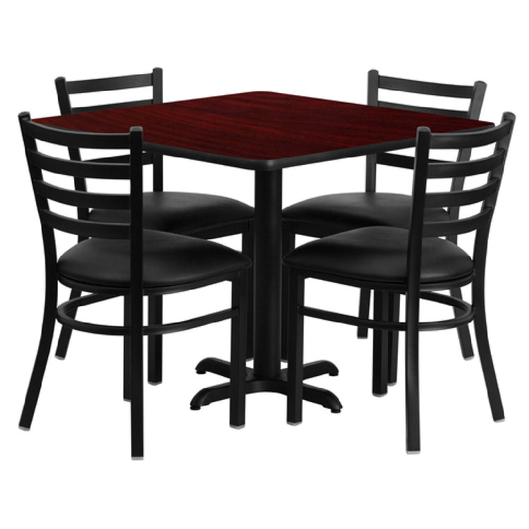 The Flash Furniture HDBF1014-GG Table and Chair Set is a versatile furniture solution designed for both residential and commercial environments. This set includes a square table measuring 36 inches in width, 36 inches in depth, and 30 inches in height, featuring a black T-mold edge with an MDF construction and a high-impact melamine core. Its mahogany laminate finish adds a touch of elegance, while the cast iron X-base with a black powder-coated finish ensures stability and durability. Accompanying the table are four chairs, each with a metal ladder back and a burgundy vinyl upholstered padded seat. The seat features a 2.5-inch thick CA117 fire retardant foam, providing both comfort and safety. With an 18-gauge steel black powder-coated frame and welded joint assembly, these chairs are built for strength and longevity. Additional features include a curved support bar and plastic floor glides, enhancing usability and protection for floors. The set is designed for easy assembly, shipped in five boxes with a lead time of 1-2 business days, making it a convenient choice for various settings, from dining areas to commercial spaces, where quality and functionality are paramount.