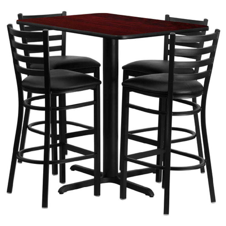 The Flash Furniture HDBF1018-GG Table and Bar Stool Set is a meticulously crafted furniture ensemble geared for both commercial and residential settings. The set includes a square table measuring 24 inches in width, 42 inches in depth, and 42 inches in height, featuring a sturdy black T-mold edge and a high-impact melamine core topped with a mahogany laminate finish. Its robust construction is supported by a cast iron x-base, which is coated with a sleek black powder finish for enhanced durability. Complementing the table are four metal ladder-back bar stools, each measuring 17 inches in width, 18 inches in depth, and 42-1/4 inches in height. These stools offer a comfortable seating experience with black vinyl upholstered padded seats filled with 2-1/2 inch thick CA117 fire retardant foam. The sturdy assembly is ensured with welded joint assembly and 18-gauge steel frames, which are clear-coated for added protection. Additionally, the stools feature two curved support bars and a footrest, with plastic floor glides to protect flooring. This set is designed for easy assembly and is shipped in five boxes, with a lead time of just 1-2 business days, making it an efficient and stylish choice for diverse market segments.