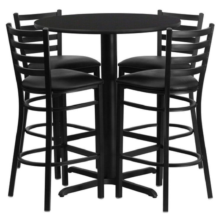 The Flash Furniture HDBF1021-GG Table and Bar Stool Set is an expertly designed furniture ensemble ideal for both commercial and residential use. This set includes a robust 30-inch diameter round table standing at 42 inches high, featuring a black T-mold edge and a high-impact melamine core for enhanced durability. The table boasts a sleek black laminate finish and is supported by a sturdy cast iron x-base with a black powder coat finish, ensuring stability. Accompanying the table are four bar stools measuring 17 inches wide, 18 inches deep, and 42-1/4 inches high. These stools are constructed with a metal ladder back and are upholstered with black vinyl padded seats containing 2-1/2 inch thick CA117 fire retardant foam, providing comfort and safety. The bar stools are further reinforced with welded joint assembly and equipped with two curved support bars and a footrest, enhancing structural integrity. Made with an 18 gauge steel clear coated frame, they feature plastic floor glides to protect flooring surfaces. This comprehensive set is shipped in five boxes with a lead time of 1-2 business days, requiring assembly upon arrival. The Flash Furniture HDBF1021-GG set offers a blend of style and functionality, catering to diverse market segments.