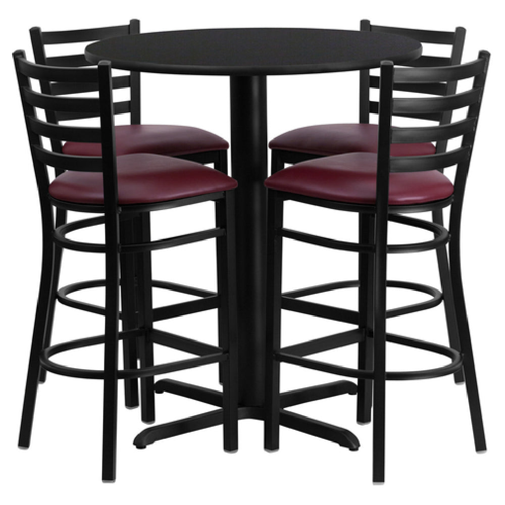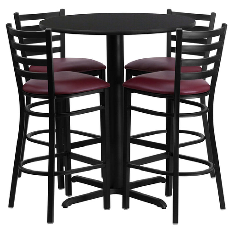 The Flash Furniture HDBF1025-GG Table and Bar Stool Set is a comprehensive furniture solution designed for both commercial and residential use. It includes a 30-inch diameter by 42-inch high table, featuring a durable black T-mold edge and an MDF core enhanced with high-impact melamine for added resilience. The table's black laminate finish and cast iron x-base with a black powder coat finish ensure stability and a sleek aesthetic. Accompanying the table are four bar stools, each measuring 17 inches wide, 18 inches deep, and 42-1/4 inches high. These stools boast metal ladder backs and are upholstered with burgundy vinyl seats padded with 2-1/2-inch thick CA117 fire retardant foam. The welded joint assembly and 18-gauge steel frame, coated for clarity, emphasize durability and safety. Designed with two curved support bars and a footrest, these stools also feature plastic floor glides to protect flooring surfaces. This product is shipped in five boxes, requiring assembly upon delivery, with a lead time of 1-2 business days. The Flash Furniture HDBF1025-GG set is an ideal choice for those seeking style and functionality, combining robust materials with a classic design to enhance any setting.