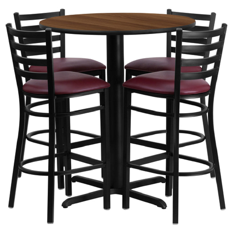 Flash Furniture HDBF1028-GG Table and Bar Stool Set combines functional design with robust construction, making it suitable for both commercial and residential spaces. This set includes a 30-inch diameter round table standing 42 inches high, featuring a black T-mold edge and a walnut laminate finish over an MDF top with a high-impact melamine core. The table's stability is ensured by a cast iron X-base with a durable black powder coat finish. Accompanying the table are four bar stools, each measuring 17 inches wide, 18 inches deep, and 42-1/4 inches high. The stools are designed with a metal ladder back and upholstered with burgundy vinyl padded seats filled with 2-1/2 inch thick CA117 fire retardant foam. Constructed with a welded joint assembly, the stools also include two curved support bars and a footrest for enhanced comfort and durability. The 18-gauge steel frame is clear coated, and plastic floor glides protect surfaces. Shipped in five boxes with a lead time of 1-2 business days, this set is engineered for easy assembly, reflecting its practical design for versatile use. Ideal for dining establishments or home bars, it combines style, safety, and sturdiness, meeting diverse market needs with its quality and design.