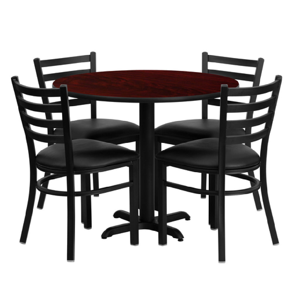 The Flash Furniture HDBF1030-GG Table and Chair Set is a versatile and robust furniture solution tailored for both residential and commercial environments. This set includes a round table with a 36-inch diameter and a height of 30 inches, featuring a black T-mold edge and a mahogany laminate finish over an MDF surface with a high-impact melamine core. The table is supported by a durable cast iron x-base with a sleek black powder-coated finish, providing stability and endurance. Accompanying the table are four chairs, each measuring 16-1/2 inches in width, 17 inches in depth, and 32-1/4 inches in height. These chairs boast a metal ladder back design, and feature black vinyl upholstered padded seats with 2-1/2 inch thick CA117 fire retardant foam for enhanced safety and comfort. The chairs are constructed with welded joint assembly and an 18-gauge steel black powder-coated frame, ensuring long-lasting use. Plastic floor glides are included to protect your flooring from scratches and wear. Shipped in five boxes with a lead time of 1-2 business days, this set requires assembly upon receipt. Its design and features make it an excellent choice for a wide range of settings, providing both style and functionality.