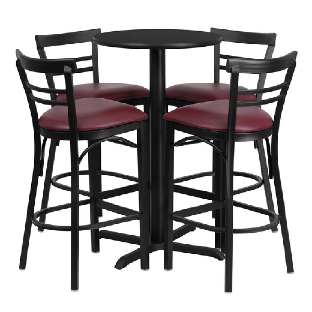 The Flash Furniture HDBF1037-GG Table and Bar Stool Set is an exceptional choice for both commercial and residential settings, featuring a round table with a 24" diameter and a height of 42". The table is crafted with a black T-mold edge and an MDF core reinforced with high impact melamine, finished in a sleek black laminate. Its sturdy construction is supported by a cast iron x-base with a black powder coated finish, ensuring durability and stability. Complementing this, the set includes four bar stools, each measuring 17"W x 19"D x 41-3/4"H, designed with metal ladder backs and burgundy vinyl upholstered padded seats. These seats contain 2-1/2" thick CA117 fire retardant foam, providing safety and comfort. The bar stools boast welded joint assembly, two curved support bars, and footrests, supported by an 18-gauge steel black powder coated frame with plastic floor glides to protect flooring. This set is shipped in five boxes with an assembly required, promising a versatile solution for diverse applications in the hospitality or home environment. With a lead time of 1-2 business days, it offers a blend of style, functionality, and safety features tailored to meet industry requirements.