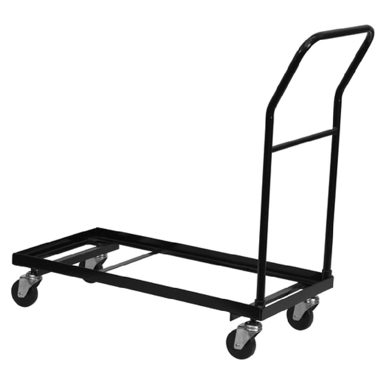 The Flash Furniture HF-700-DOLLY-GG Folding Chair Dolly is a highly efficient solution designed to streamline the transportation and storage of folding chairs in a variety of settings. This dolly measures 18-1/2 inches in width, 39-1/2 inches in depth, and 41-1/2 inches in height, offering a robust structure capable of supporting up to 36 BH-D0001 and LE-L-3 chairs, or 20 LE-L-1 chairs, making it indispensable for venues requiring quick and easy chair setup and takedown. The dolly is equipped with a 1-inch round tubular handle and dual support braces, ensuring stability and ease of maneuvering. Its heavy-duty 1/8-inch thick L-shaped steel frame provides exceptional durability, suitable for commercial use. For added mobility, it features four 4-inch diameter polyolefin swivel casters, enhancing its versatility across various environments such as event halls, conference centers, and schools. The product comes in a sleek black finish and requires assembly upon delivery. Typically, in-stock items ship within 24 hours, allowing for efficient planning and logistics for businesses and institutions that rely on timely equipment management. This folding chair dolly is designed to meet the demands of high-traffic venues, providing a reliable and practical solution for chair storage and transport needs.